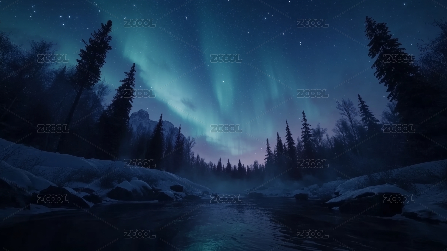 极光映雪河流夜景