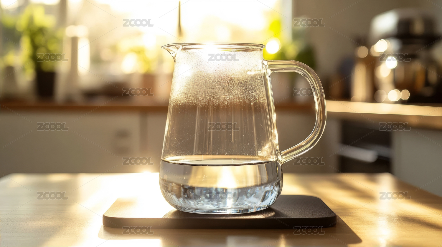 玻璃,水壶,玻璃杯,编织盘,室内,光线,阳光,静物,家居,摆件