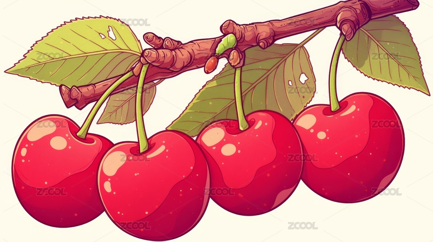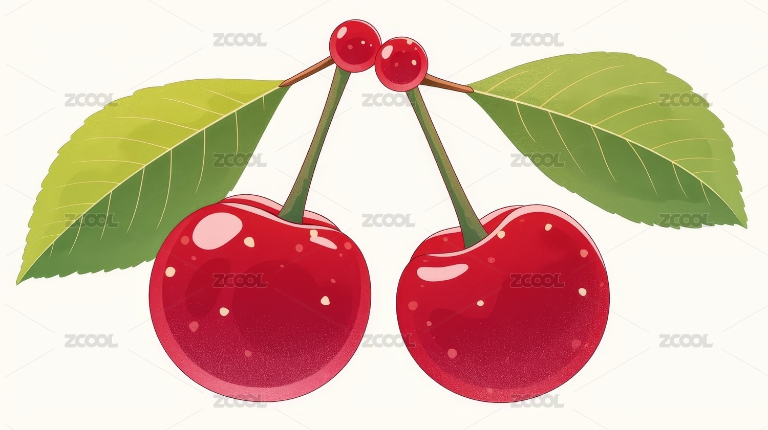鲜红樱桃簇拥绿叶的可爱插画