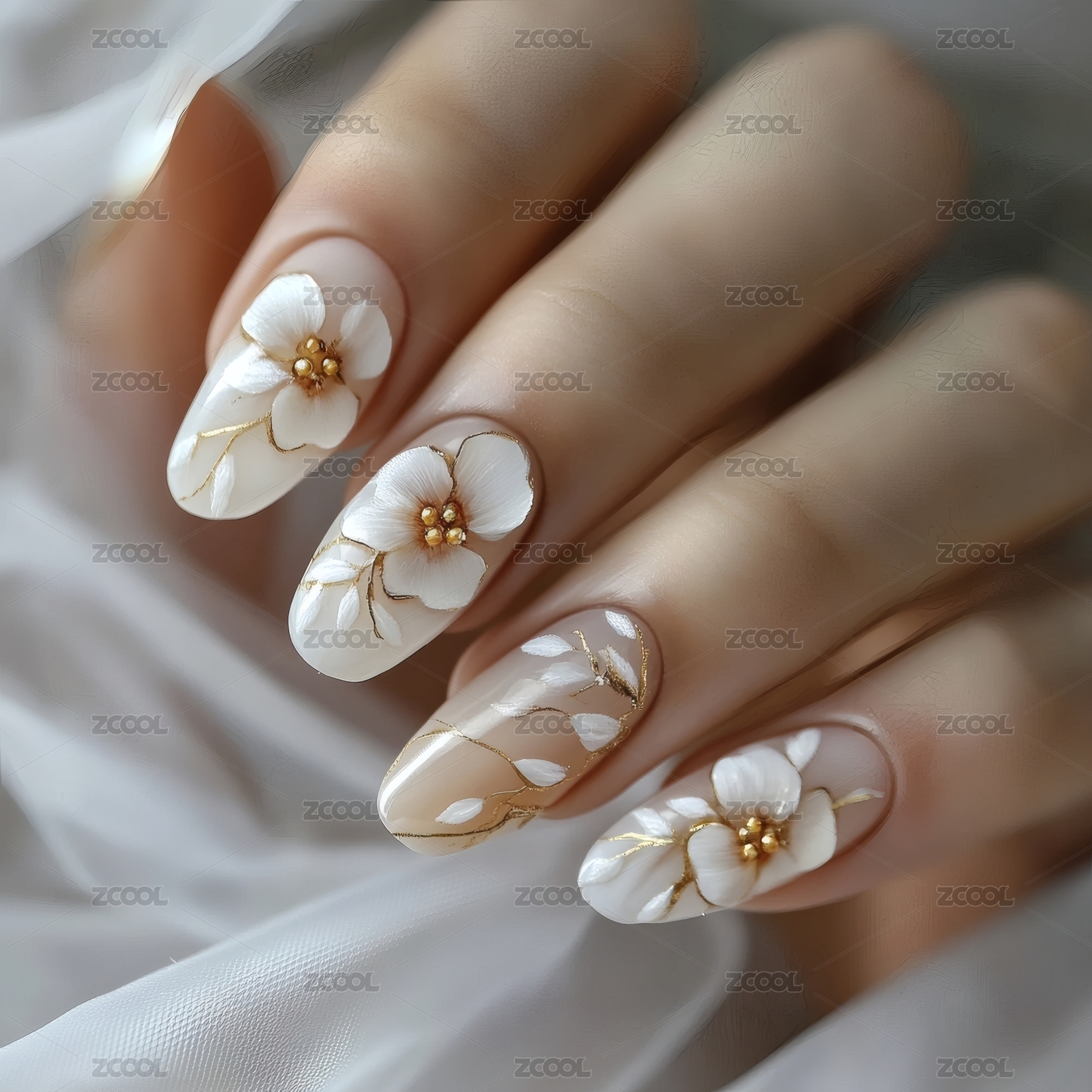 指甲,美甲,浅绿色,光泽,手,花朵,花瓣,花蕊,叶子,浅粉色