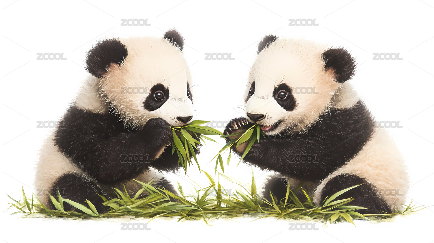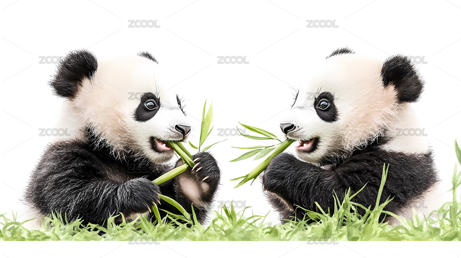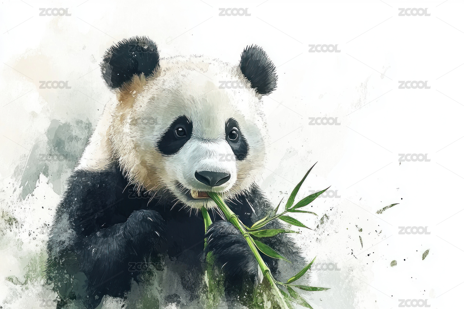 水墨插画风中国国宝吉祥物熊猫拿着竹子微笑