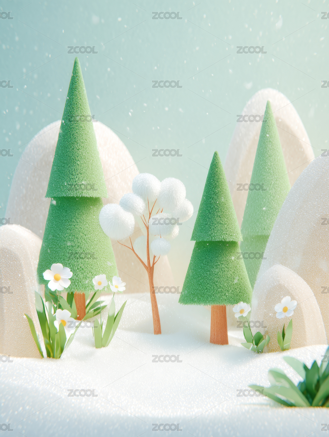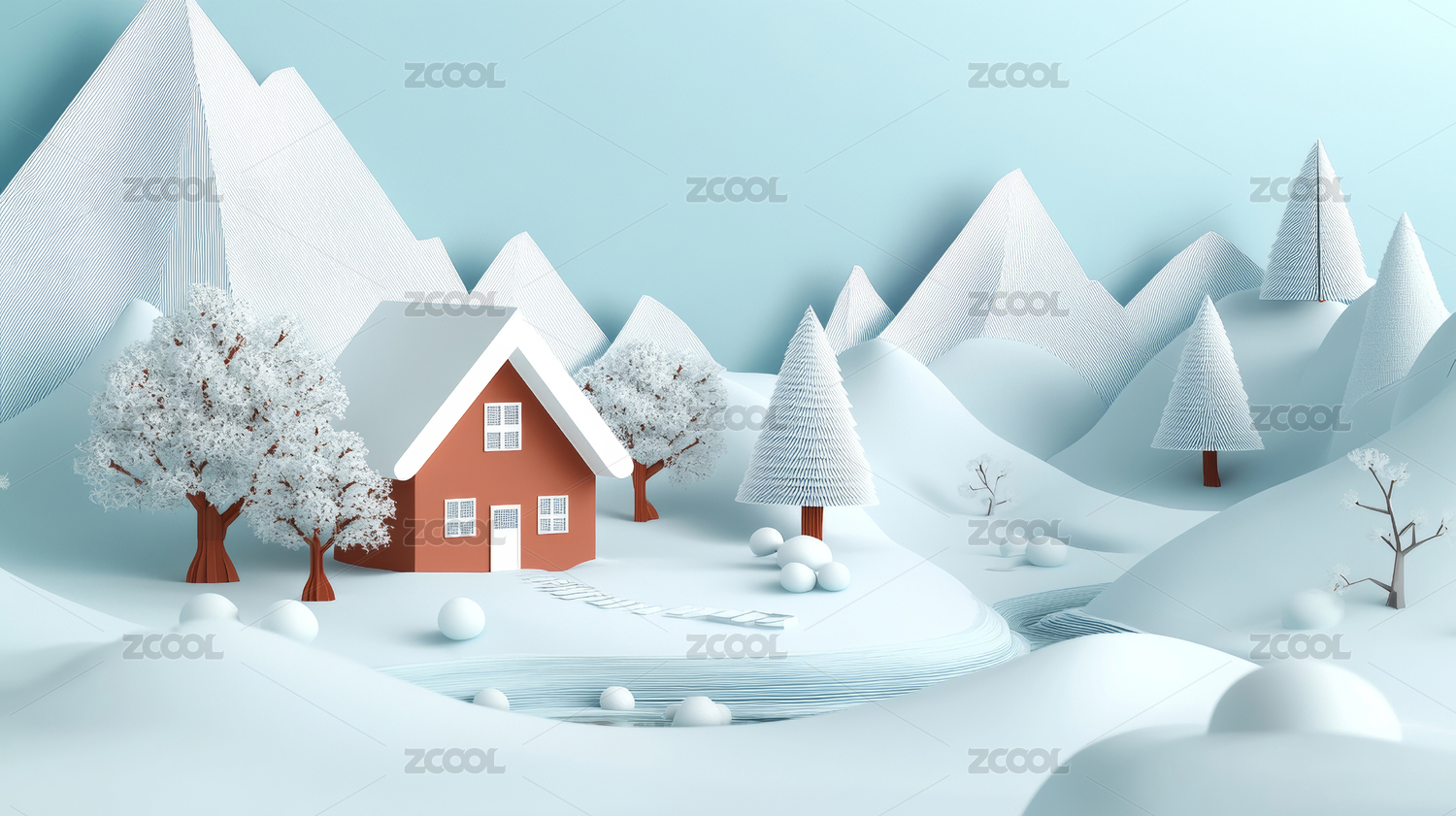 冬天清新明亮下雪的山丘河谷3D卡通背景