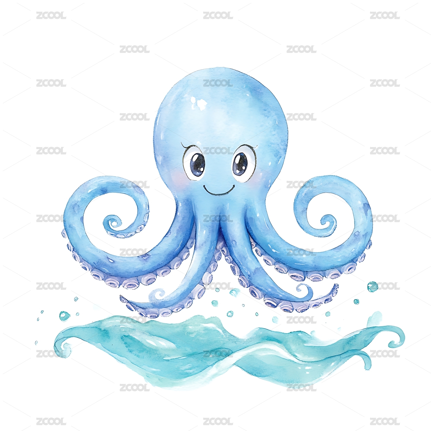 章鱼,卡通,插画,蓝色,触手,微笑,水彩,艺术