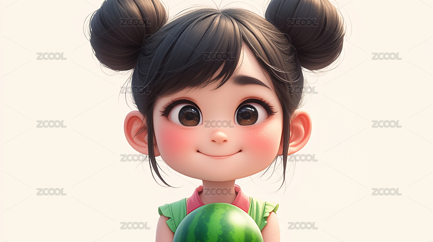 清爽夏日抱着西瓜开心笑的可爱卡通小女孩