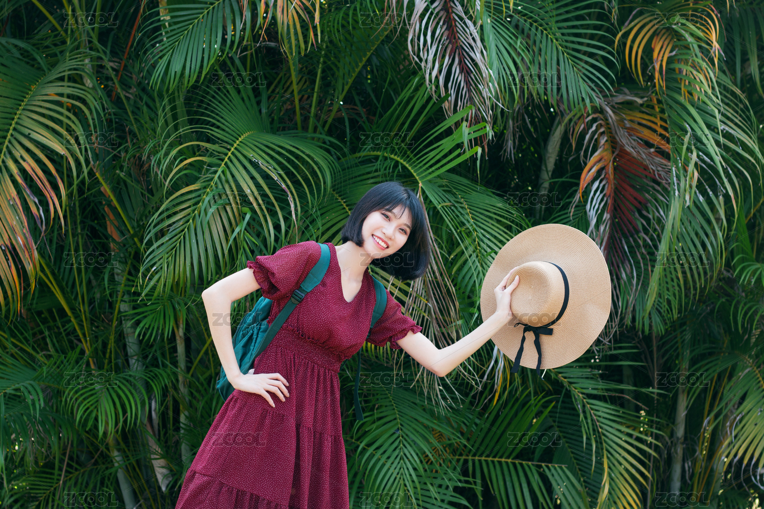 一只手拿着帽子向前跑的女孩棕榈树做背景
