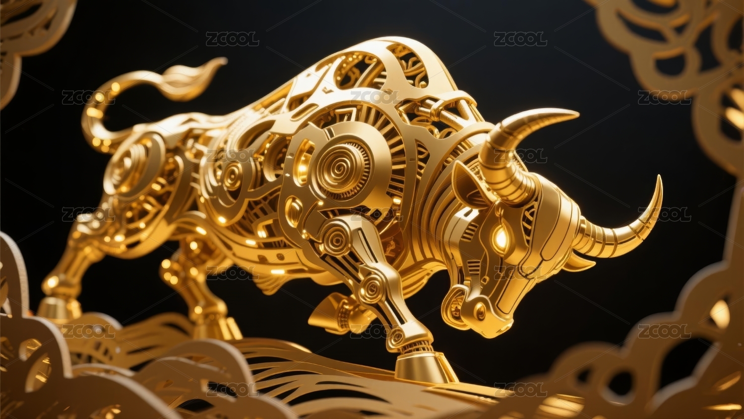深黑背景下闪耀的金色牛雕像