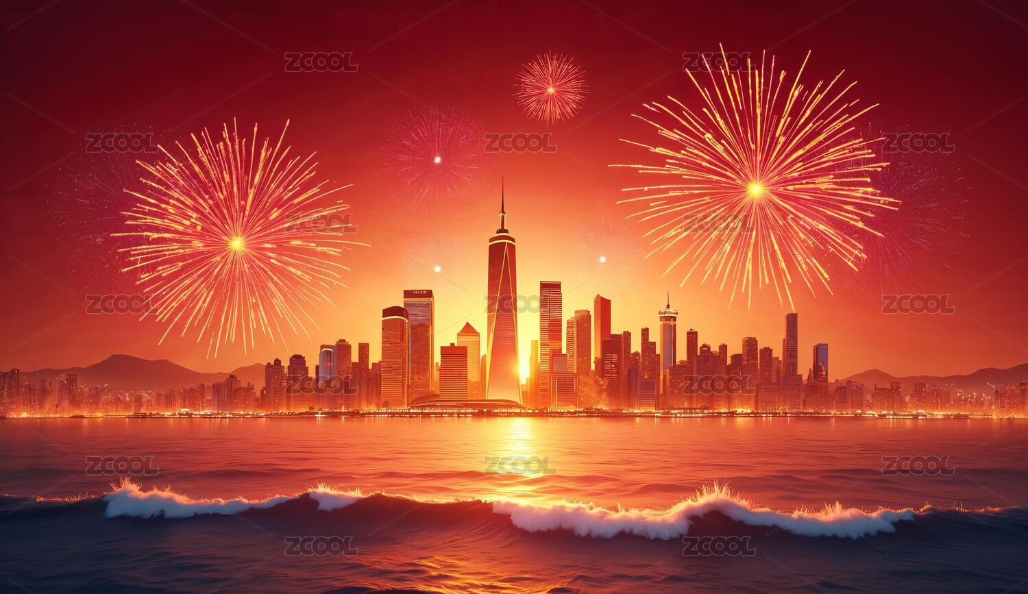 绚丽烟火下的城市夜景