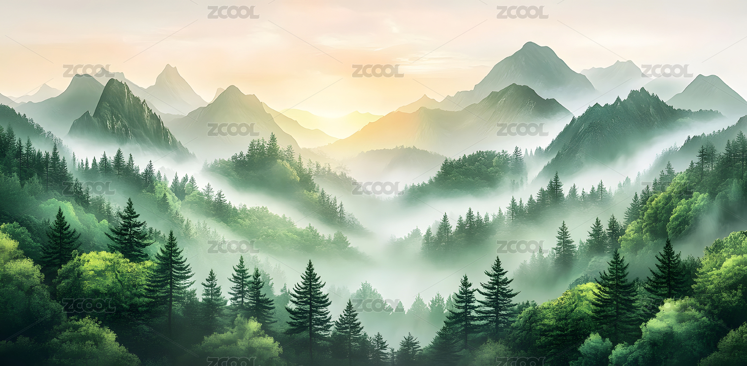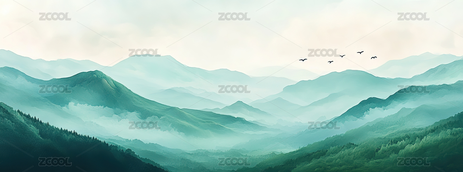 景色,祥和,山峰,薄雾,宁静,清晨,飞鸟,阳光,绿色,自然