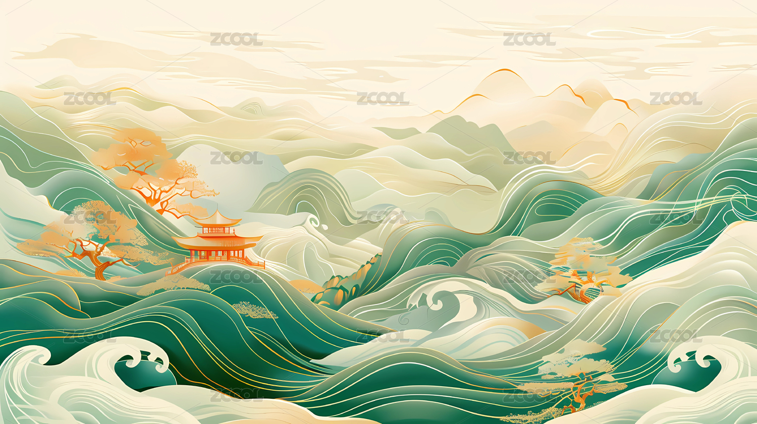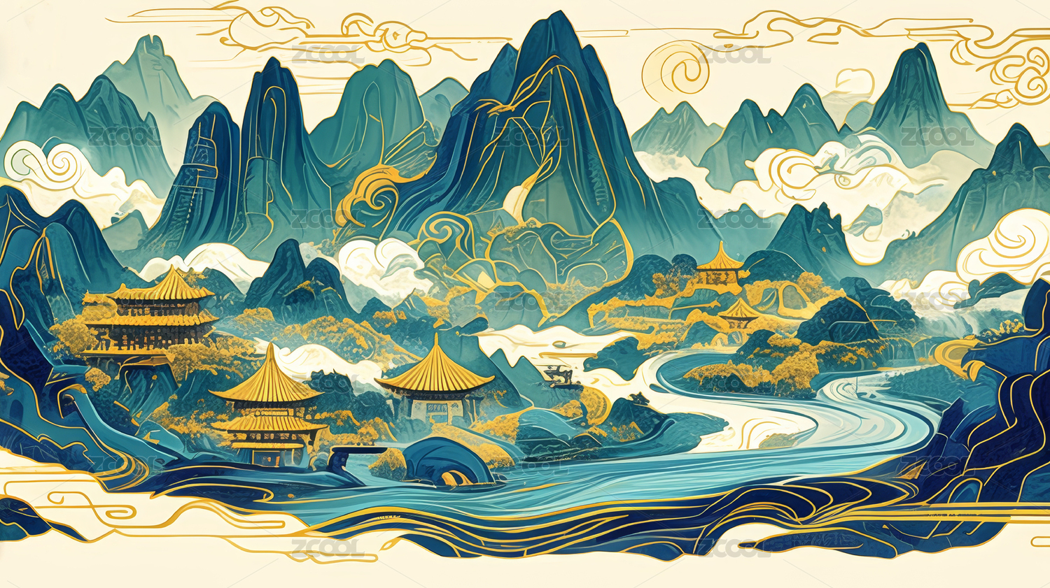 国潮中国风鎏金山水背景抽象插画