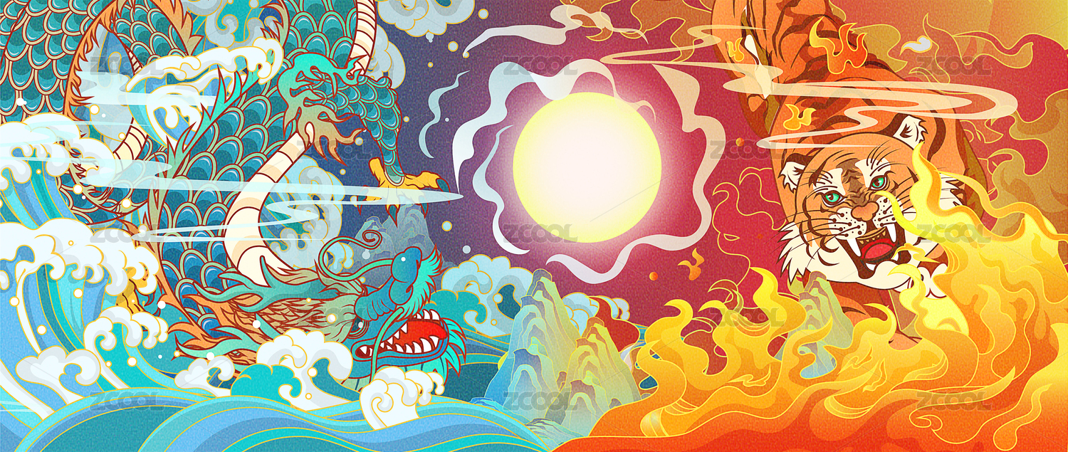 水火之下的龙虎相争的国潮风适量插画横版