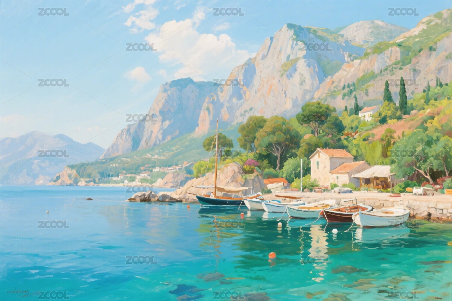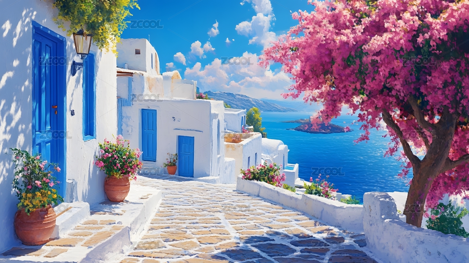 自然,树木,阳光,油画,花朵,风景,房屋,地中海,海景,沙滩