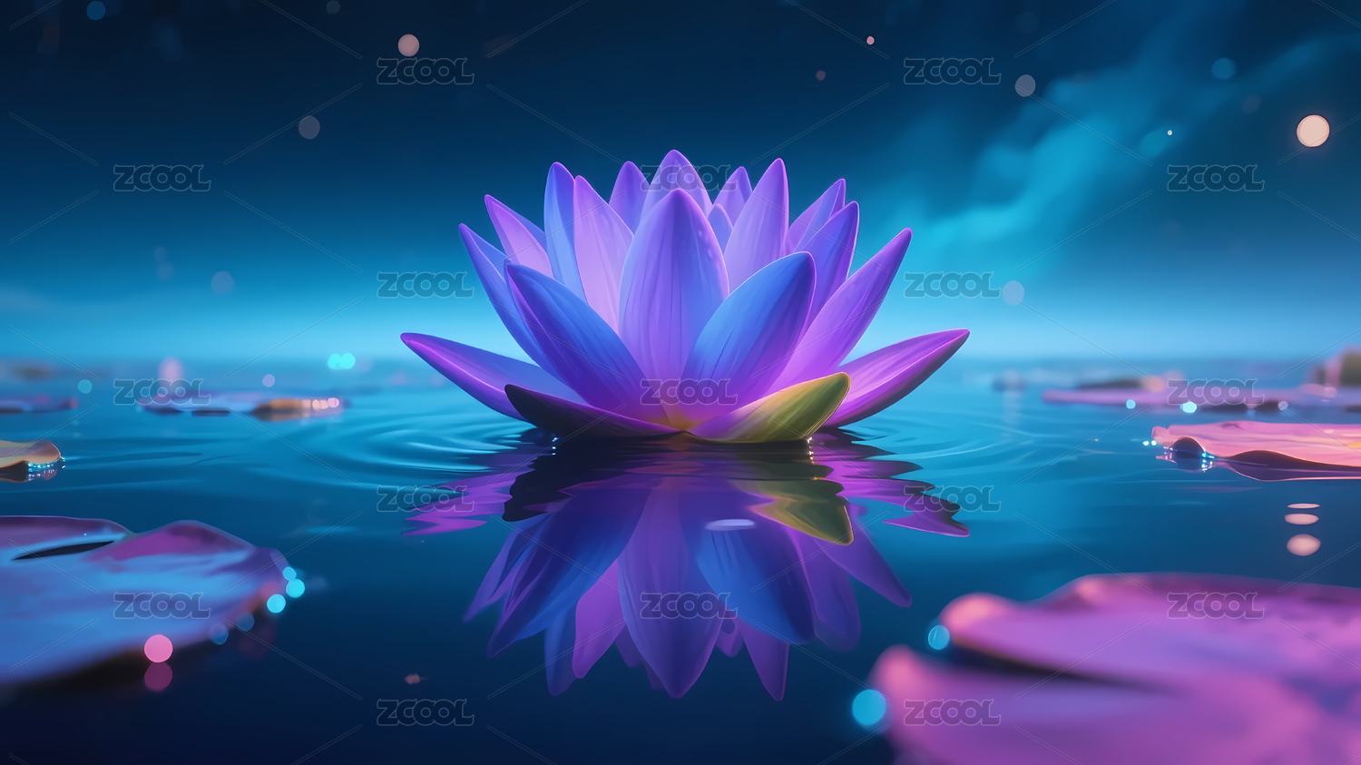 魔法发光睡莲在水塘中美丽盛开的特写插图