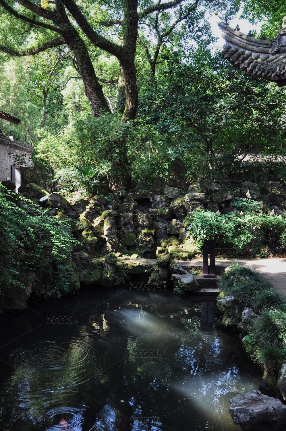 苏州园林沧浪亭公园,湖面水倒影雨滴涟漪,