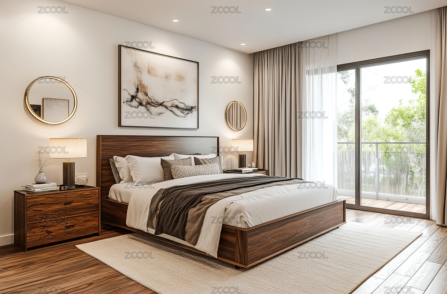 卧室,床,挂画,吊灯,绿植,地毯,落地窗,现代,家,设计