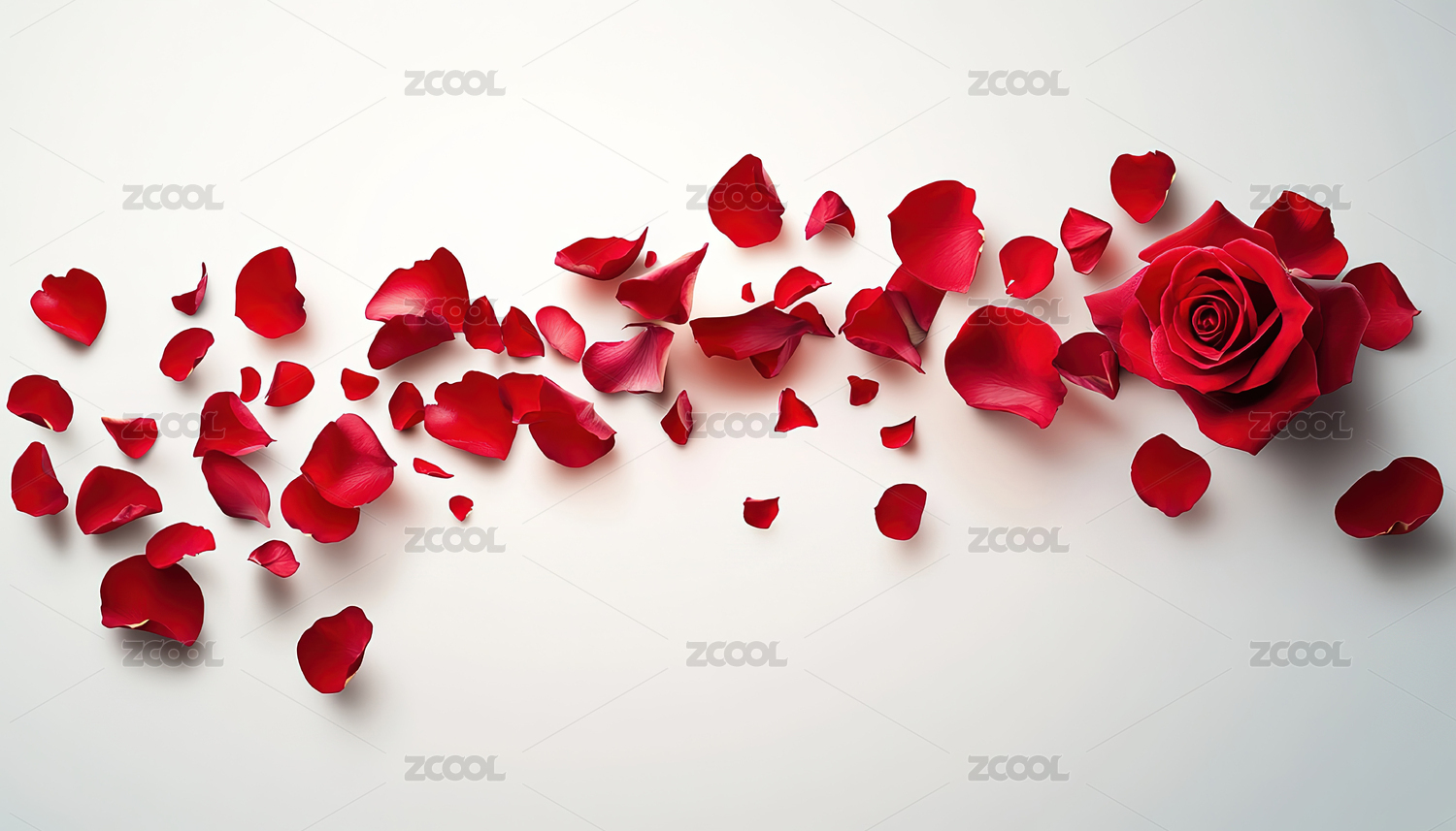 红玫瑰花瓣散落在白色背景上