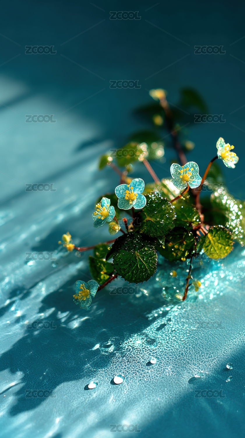 水滴中的小花与绿叶