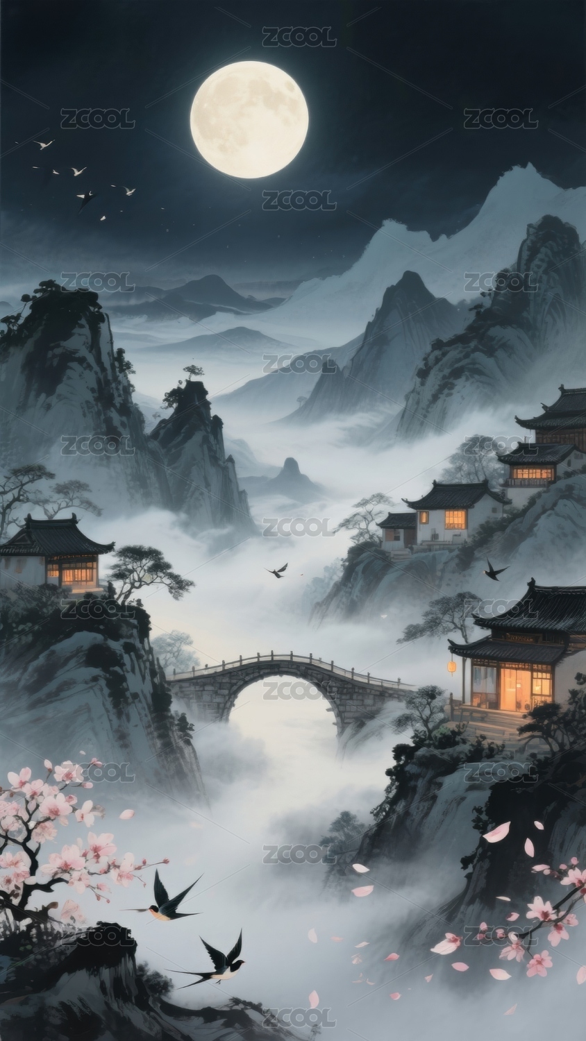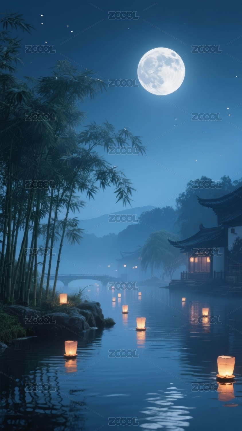 服装,景色,人物,意境,月亮,树木,河流,古装,山水,中秋