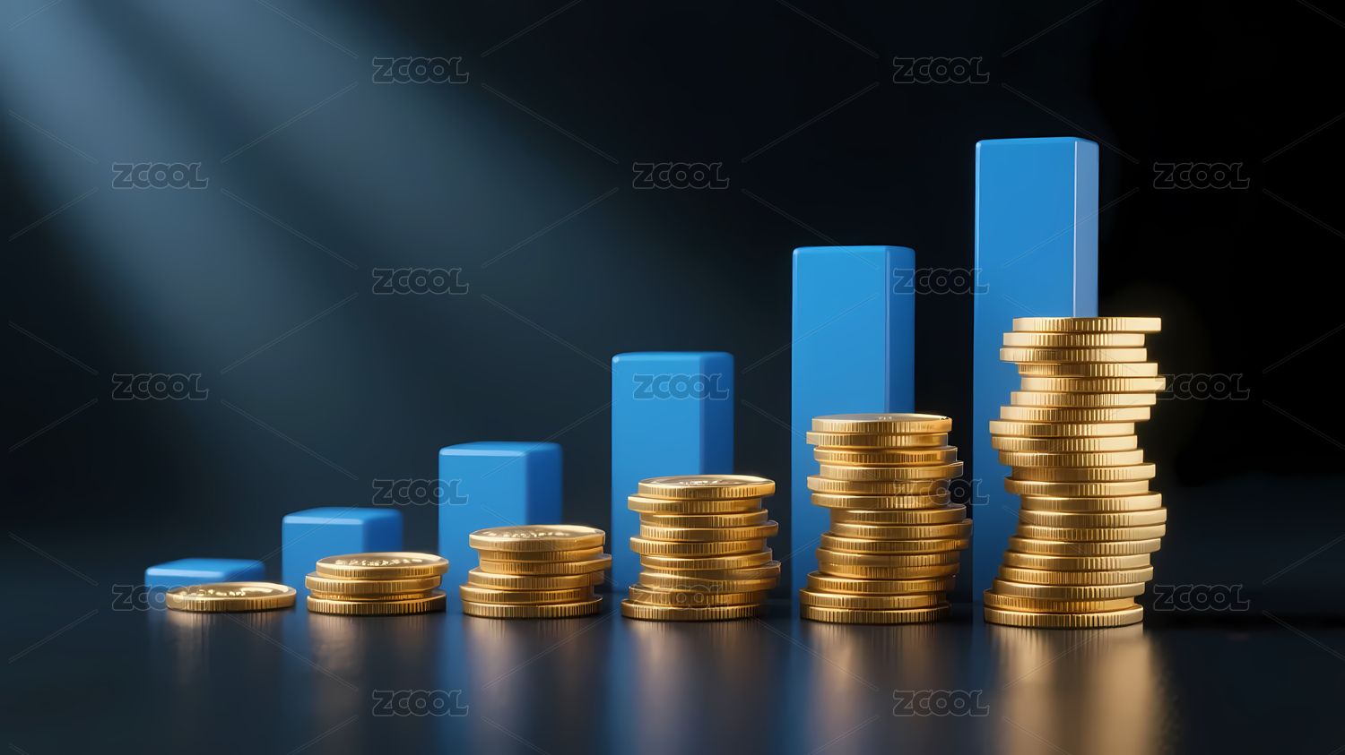 金色硬币堆叠成高楼,箭头图表显示增长趋势