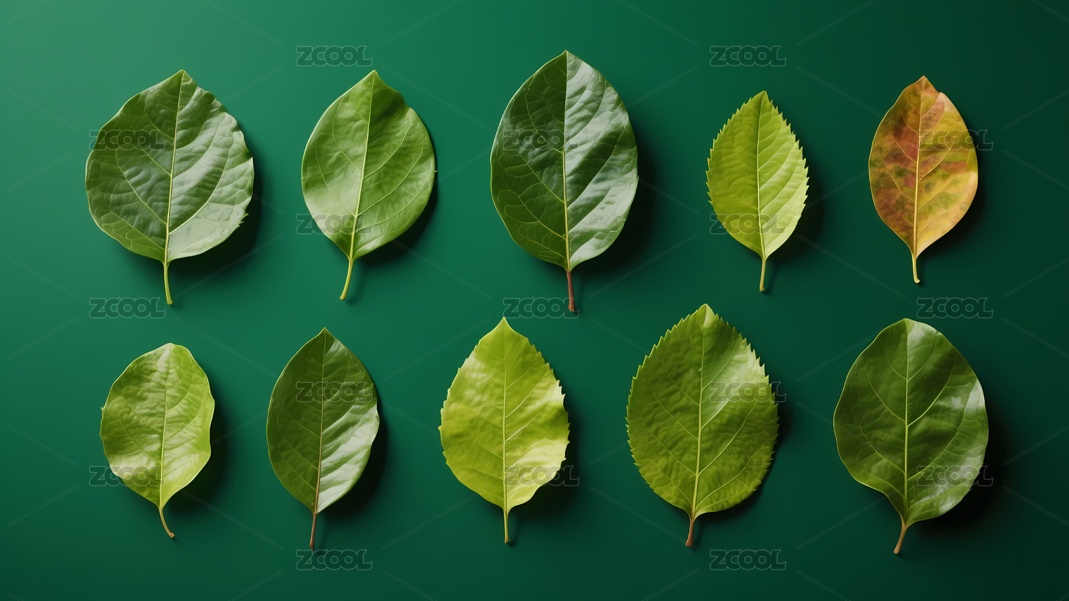 十片绿叶排列背景深绿