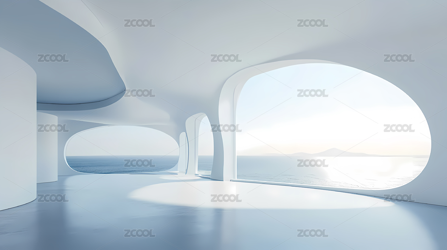 纯白镜面海滨建筑空间