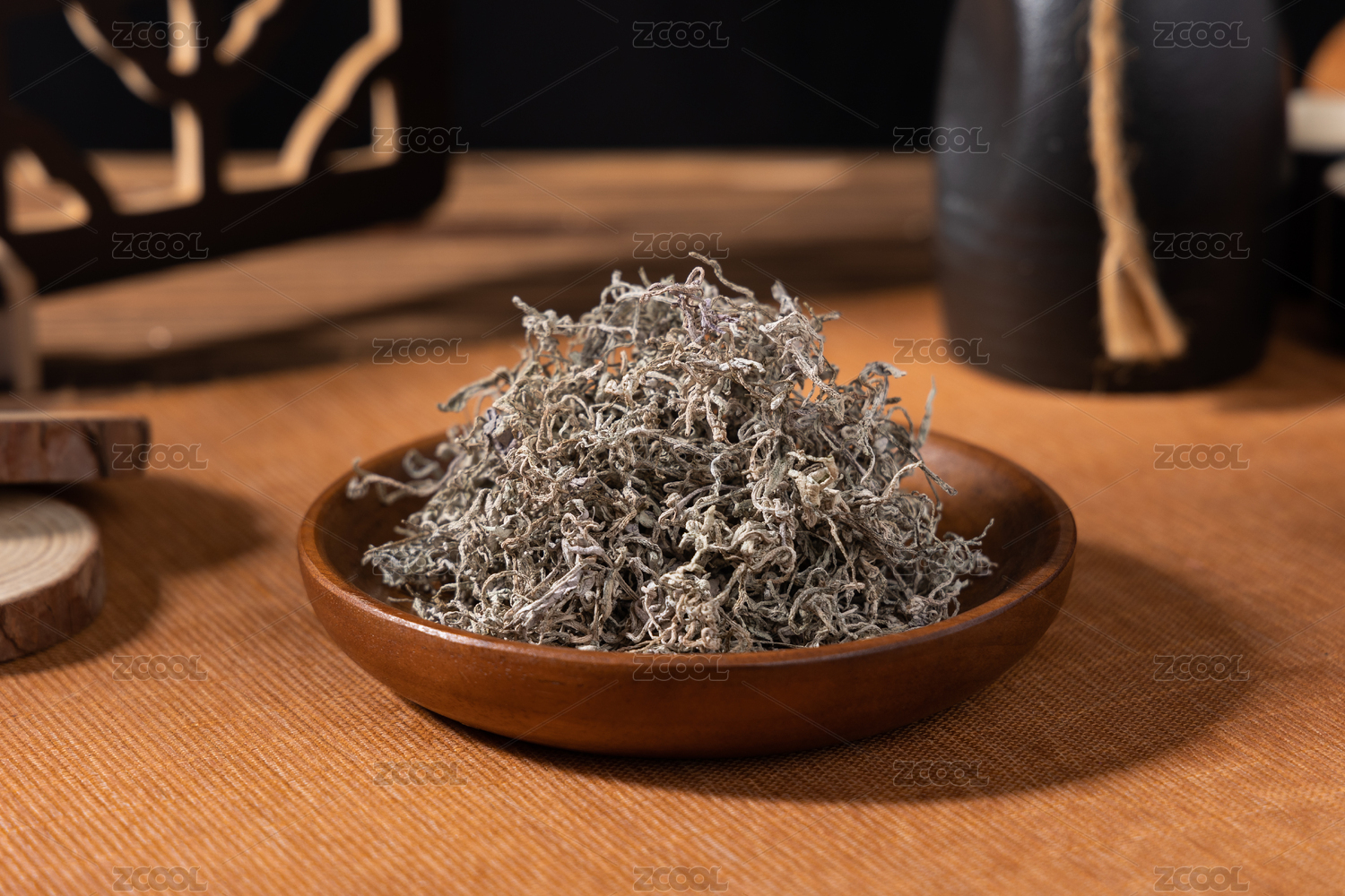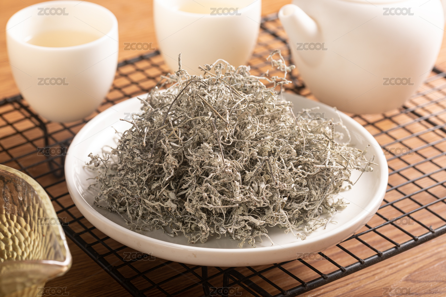 传统中式背景中桌子上装在碗里的霉茶茶叶