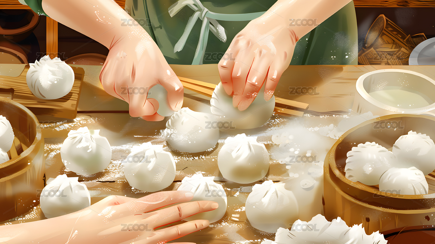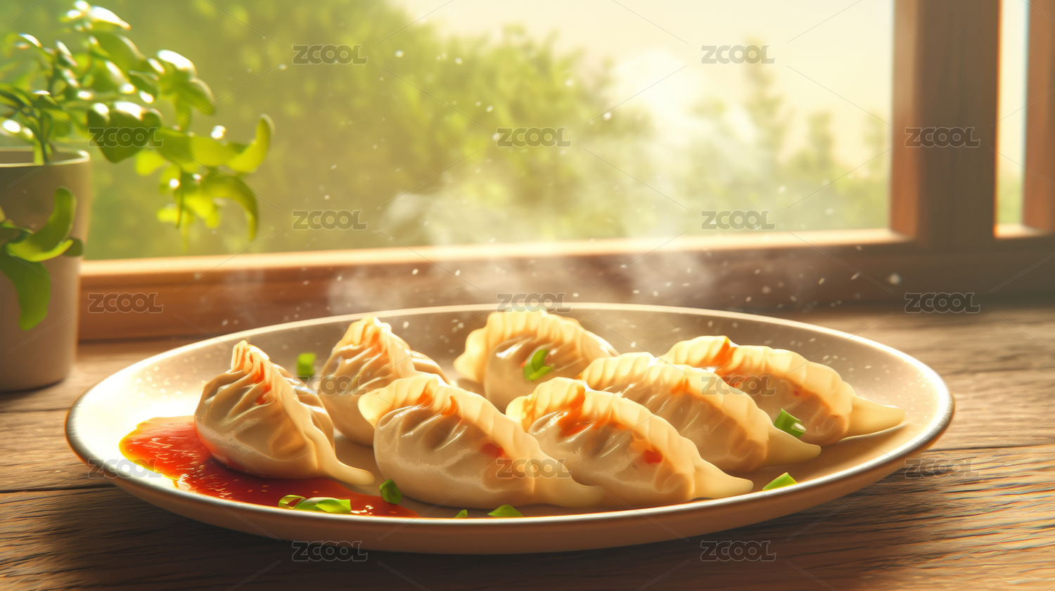 竹蒸笼旁的新鲜蔬菜与蘸酱