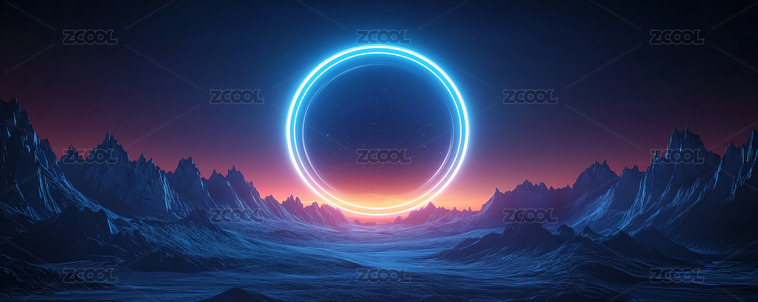 夜空下蓝调荒原中的发光圆环