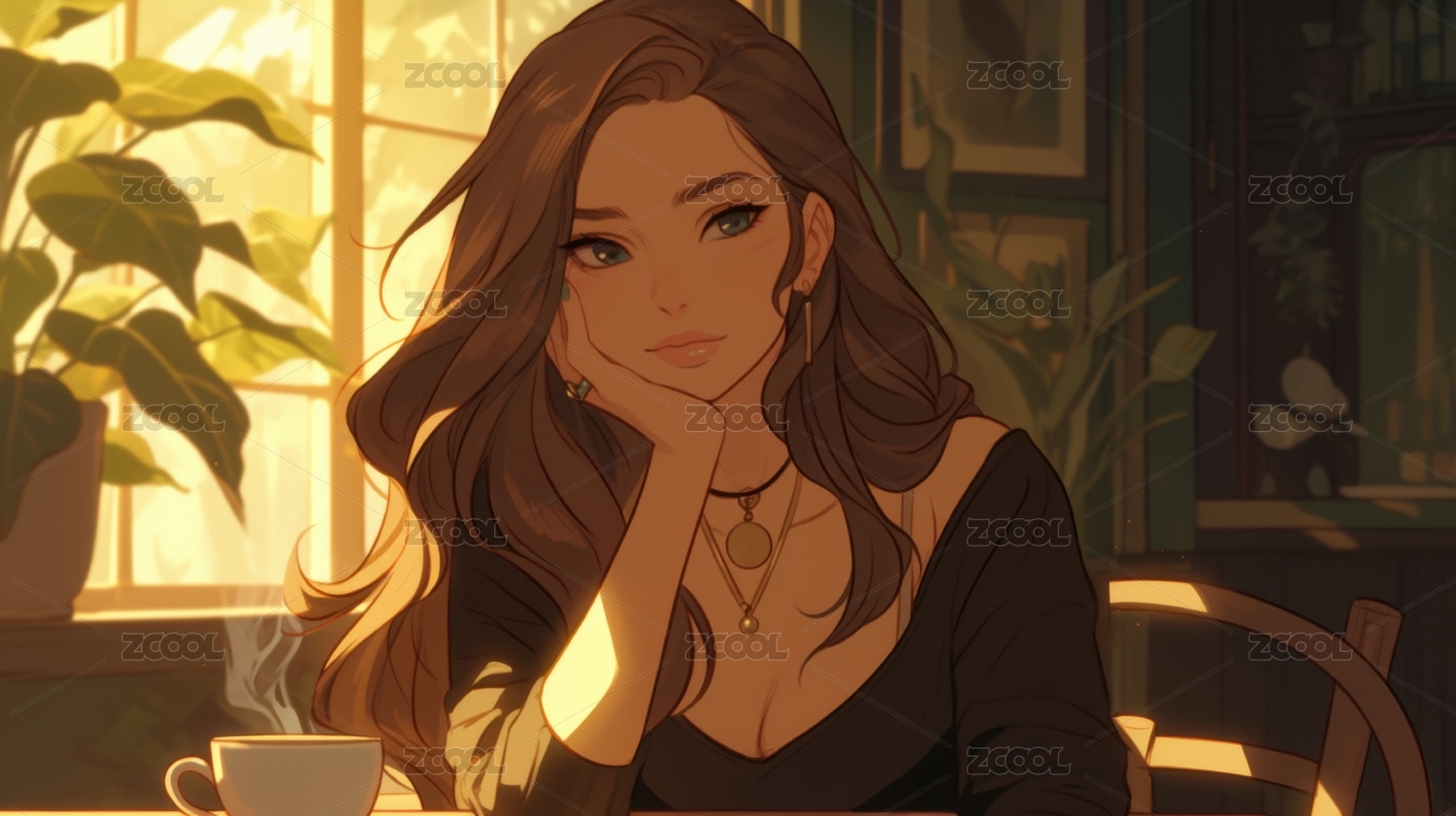 夕阳窗边沉思的女子