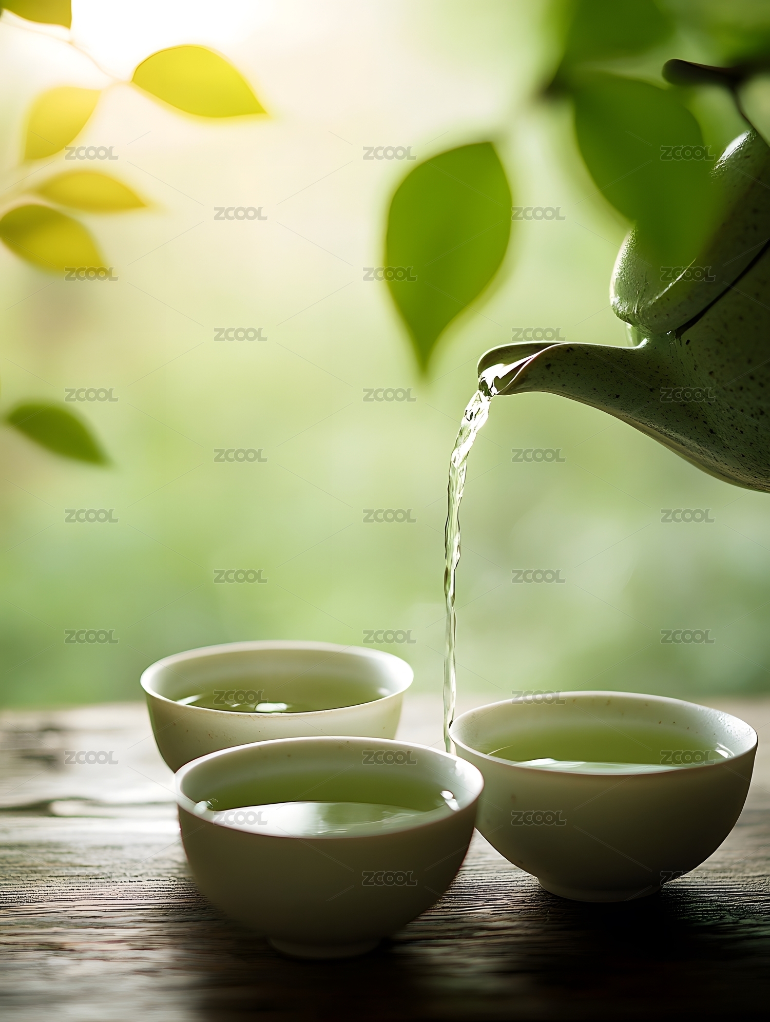 清新,自然,柔和,绿叶,桌面,光斑,茶具,茶壶,茶杯,茶水