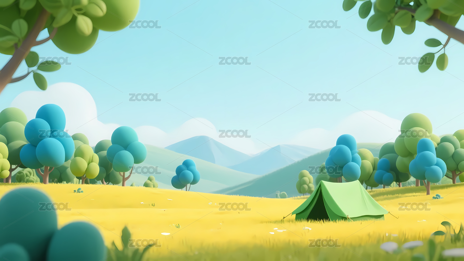 绿色帐篷黄草蓝树山景