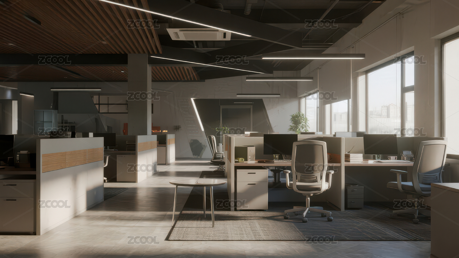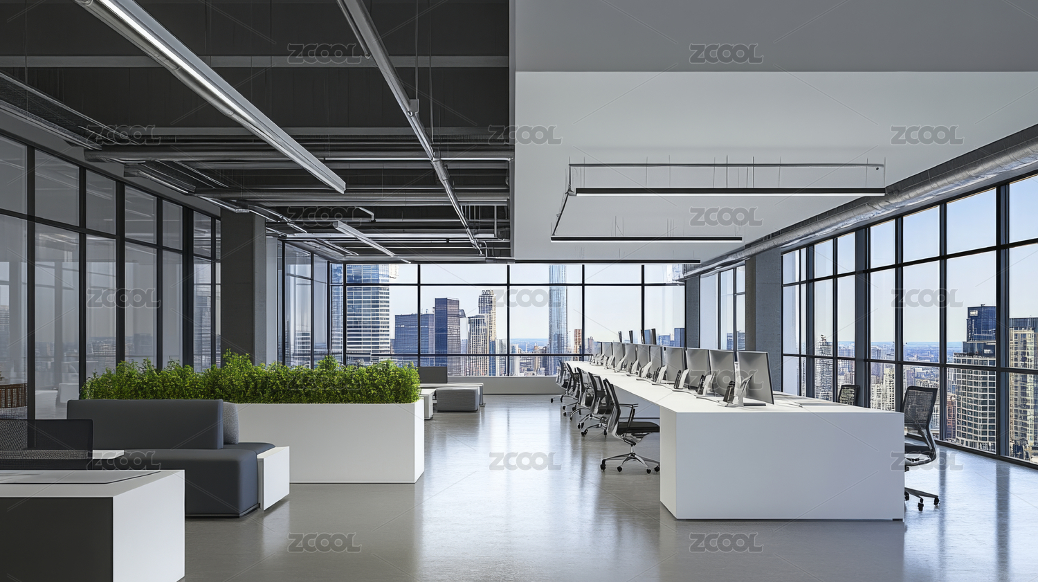 办公室,夜晚,城市,景观,植物,电脑,工作区,窗户,灯光,现代化