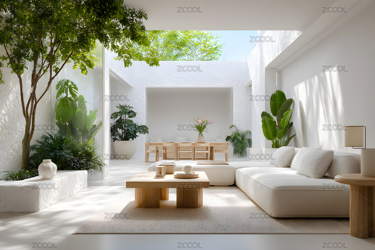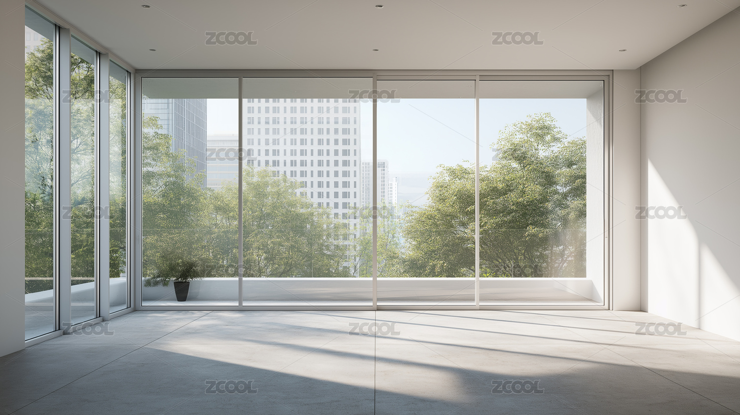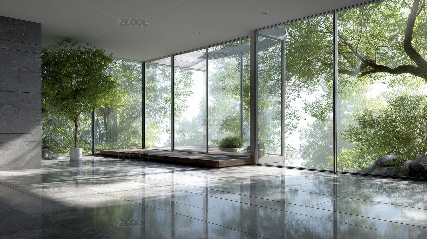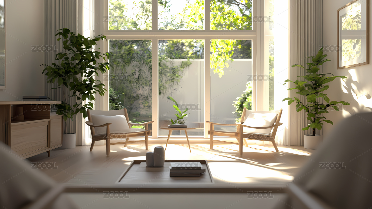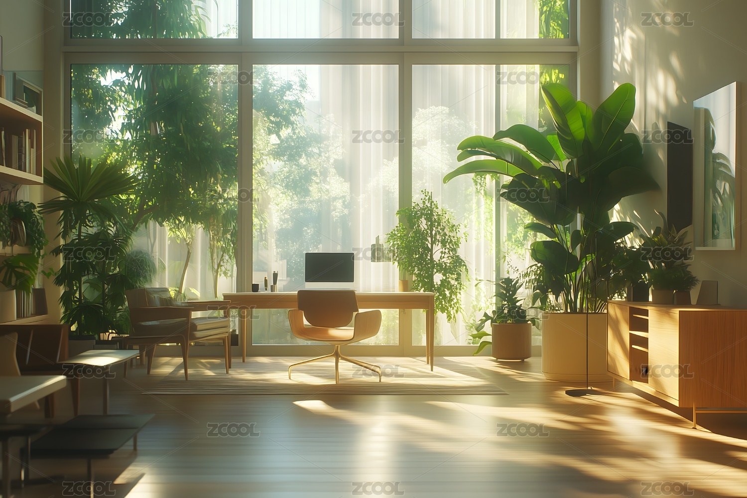 现代,豪华,客厅,大窗户,植物,沙发,阳光,地毯,家具,室内