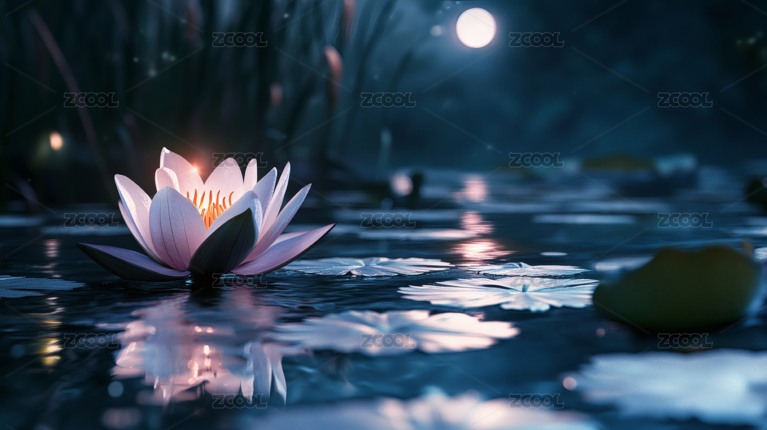 梦幻,景色,宁静,水面,蓝色,粉色,唯美,光点,夜晚,花朵