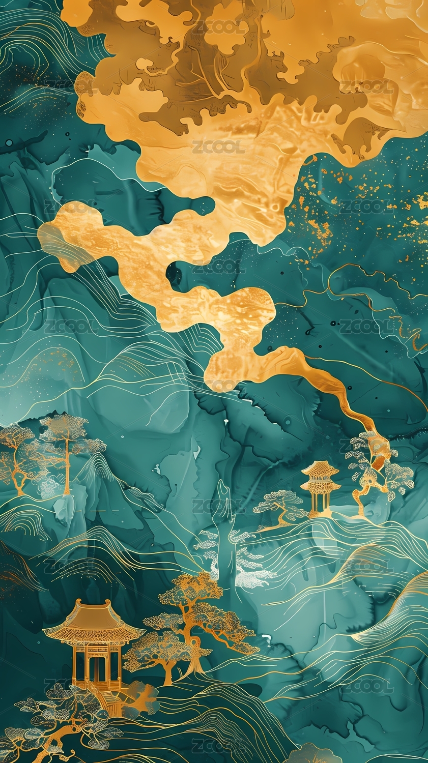 中国,山水,金色,蓝色,绿色,山,亭子,树,镀金,流动