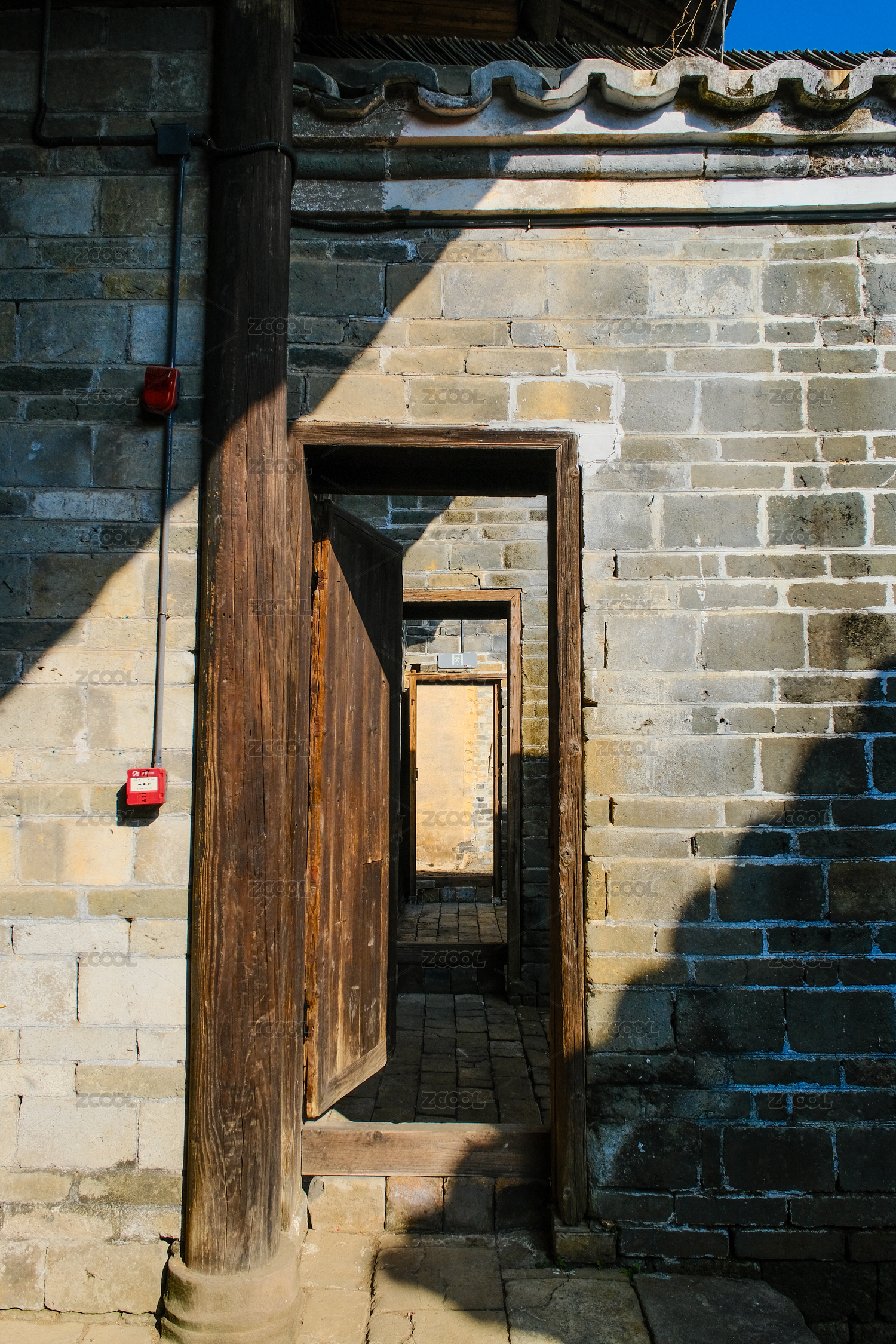 阳光下古镇传统民宅建筑局部特写