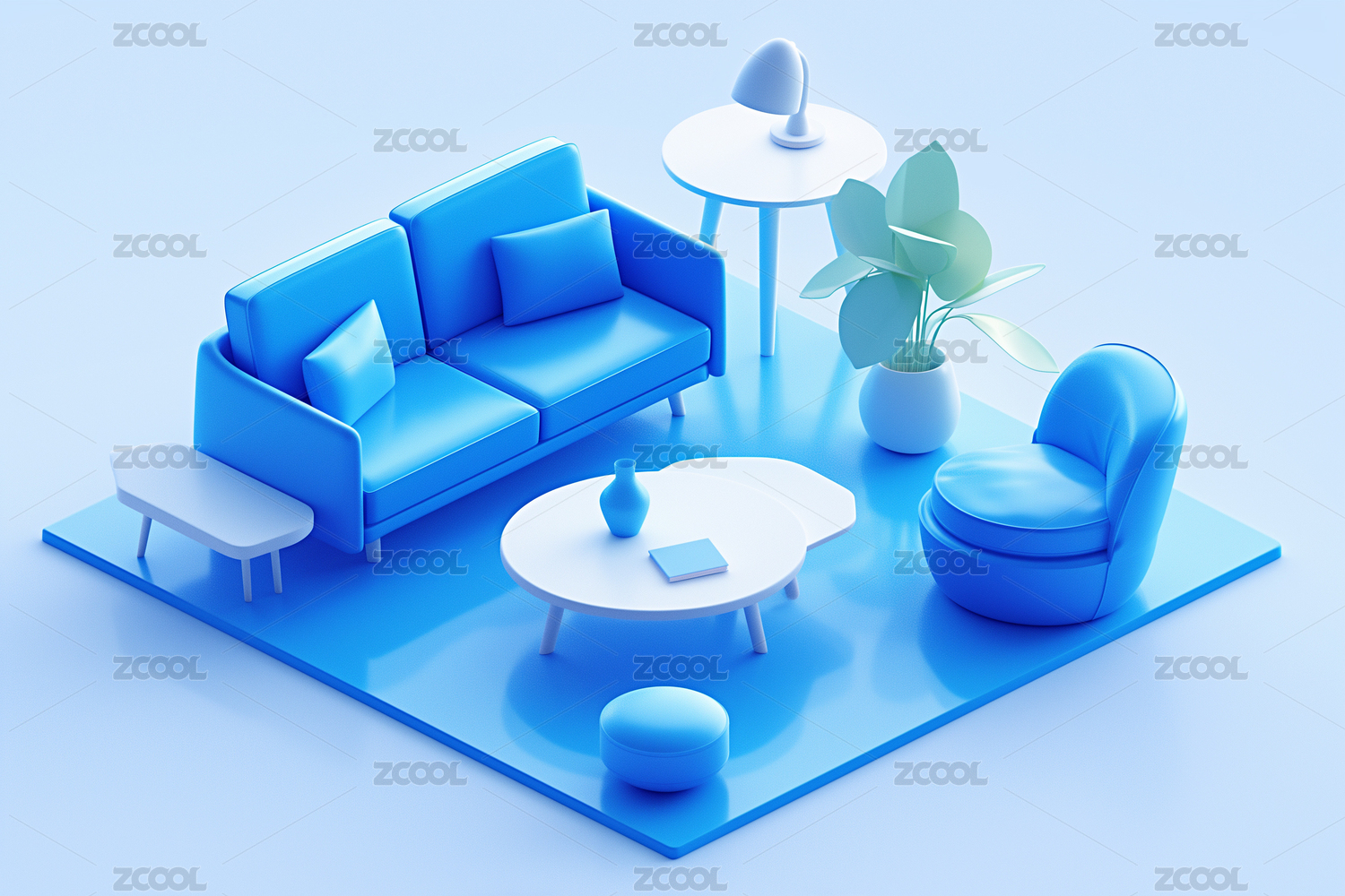 冷色客厅装修俯视立体轴测图3D卡通插画