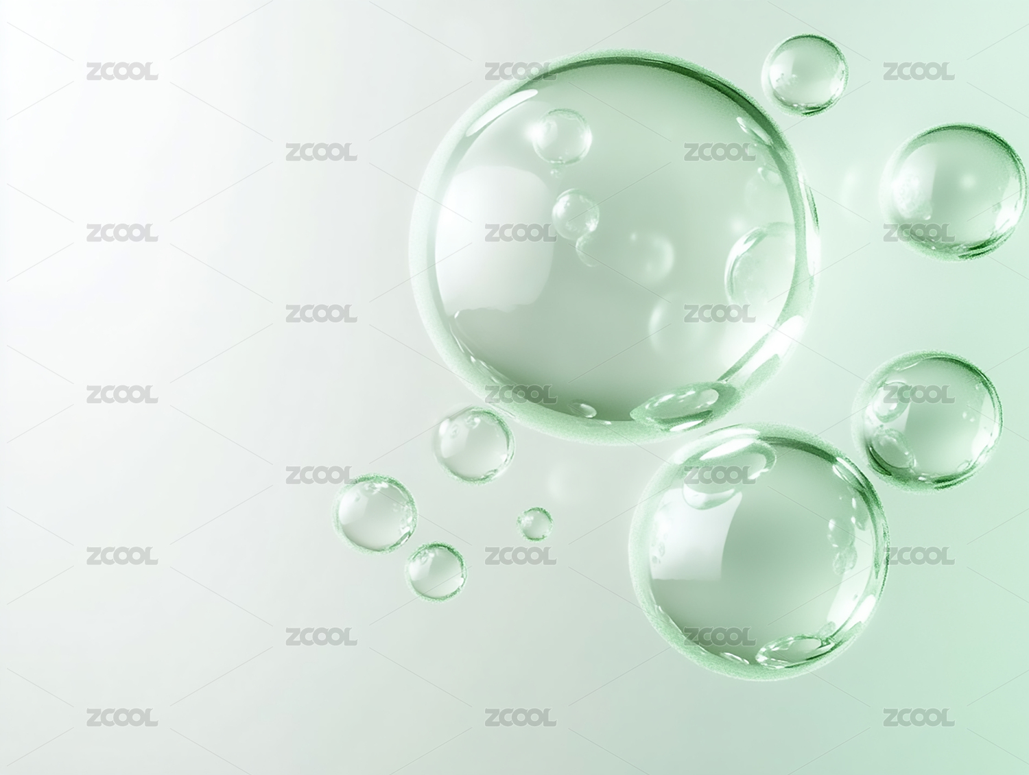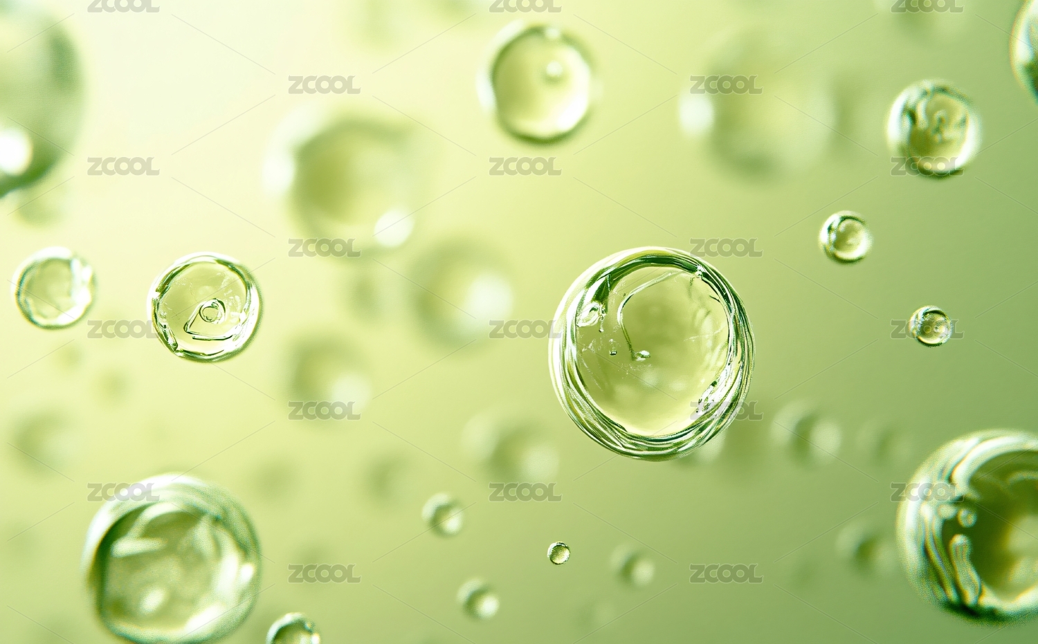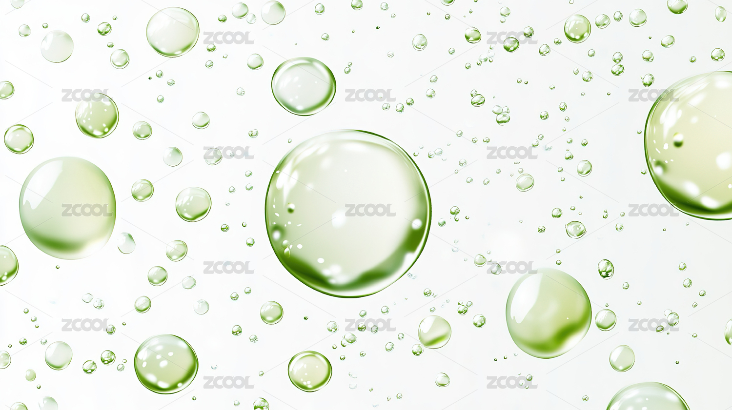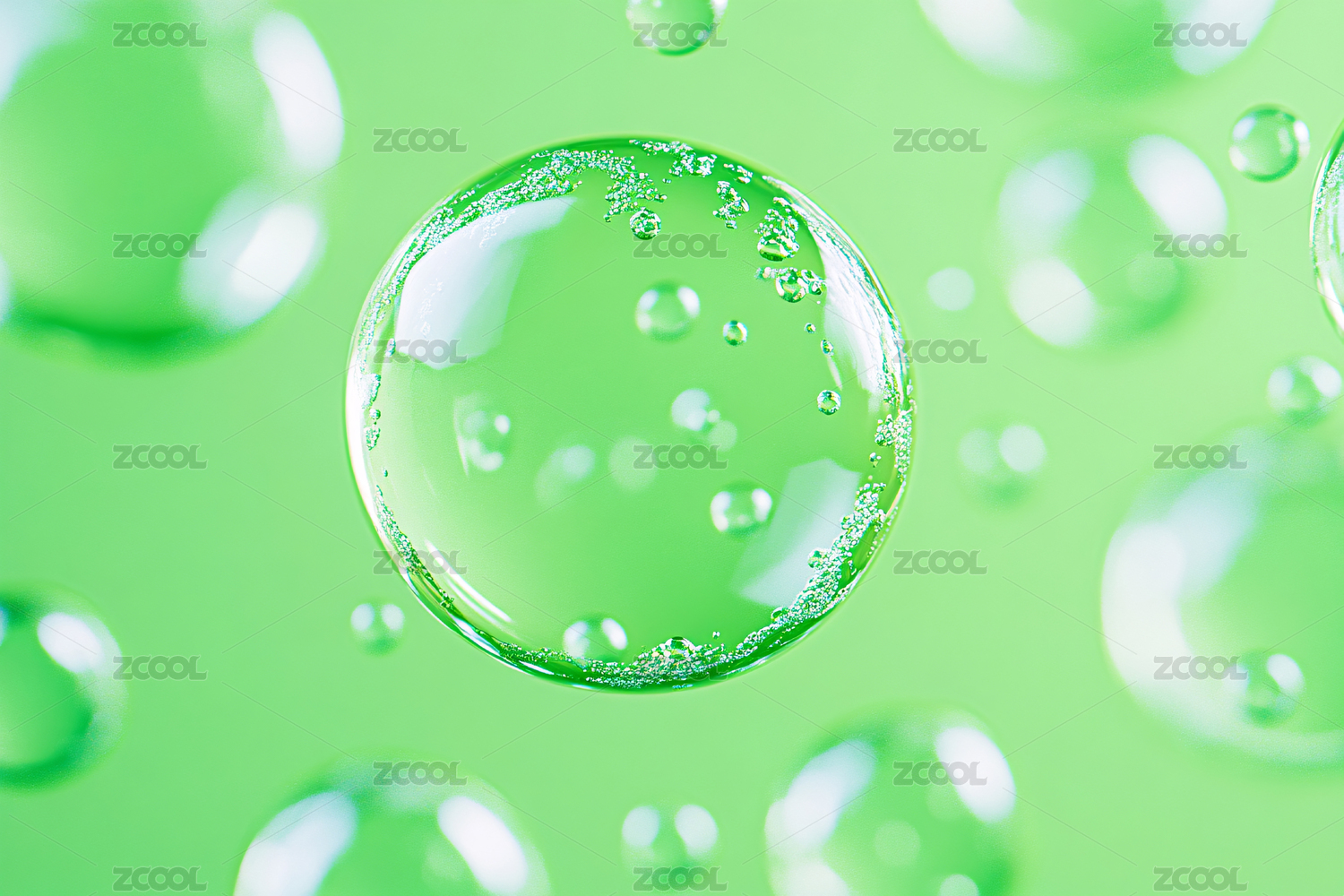 光滑水面绿色背景中的泡泡化妆品成分插图