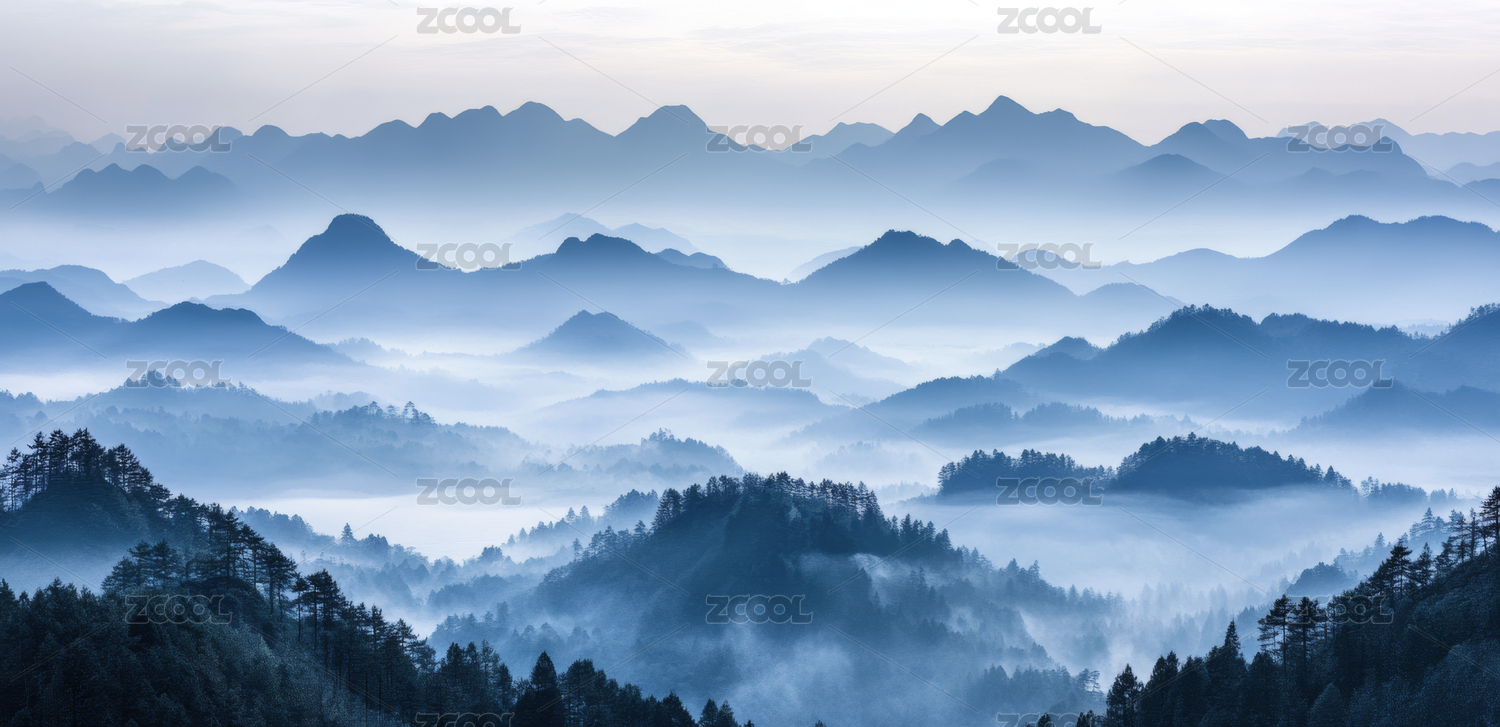水墨云雾缭绕群山,意境悠远,宁静祥和