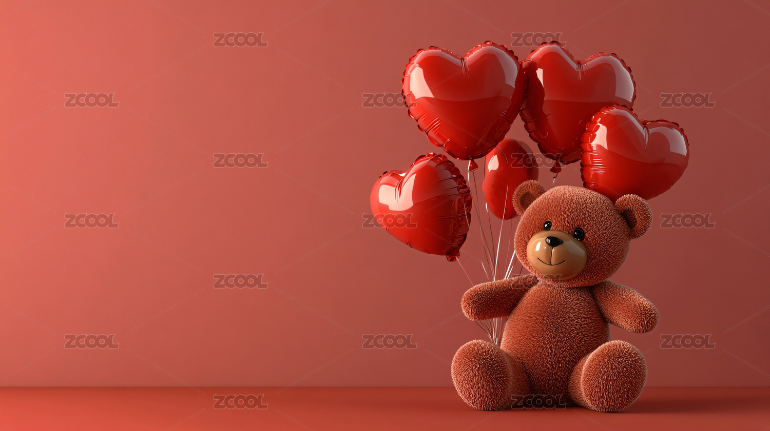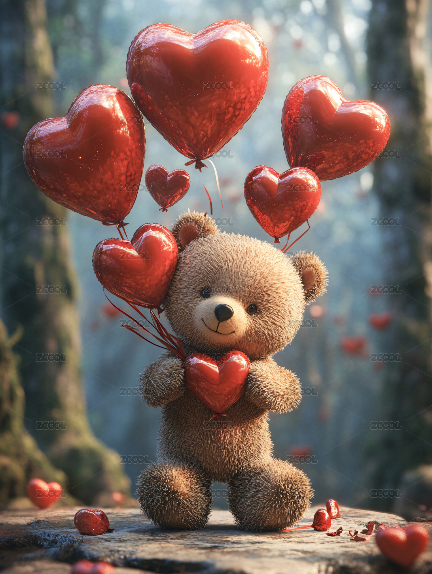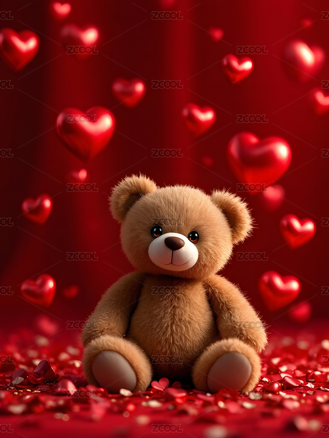 空中漂浮着红色爱心的场景中的可爱毛绒熊