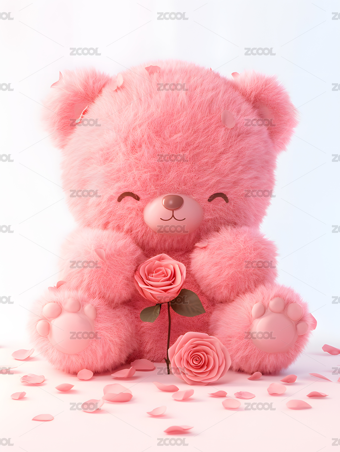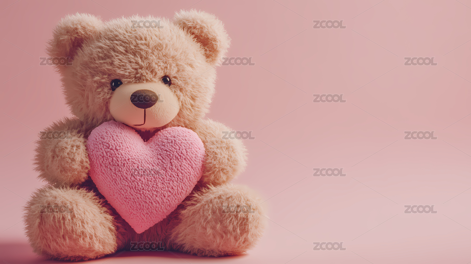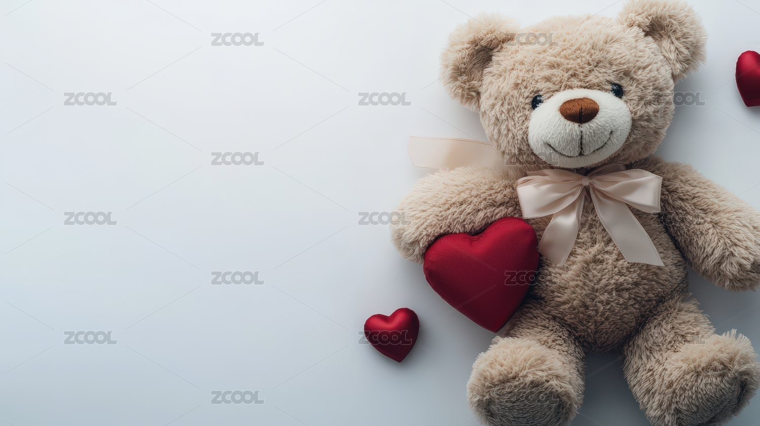 空中漂浮着红色爱心的场景中的可爱毛绒熊