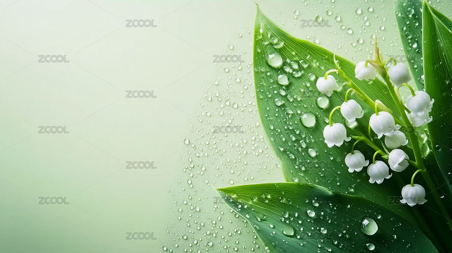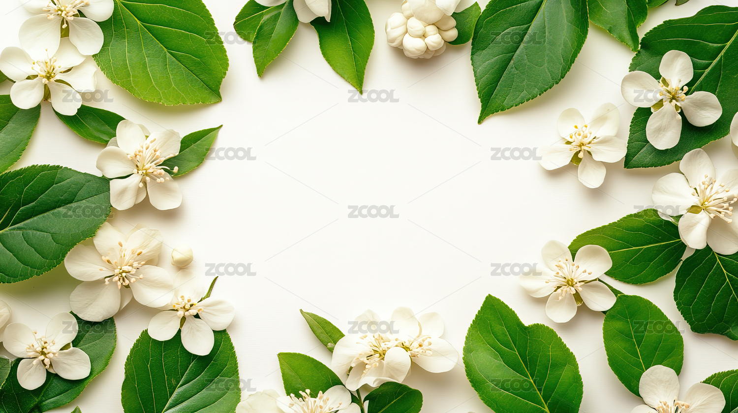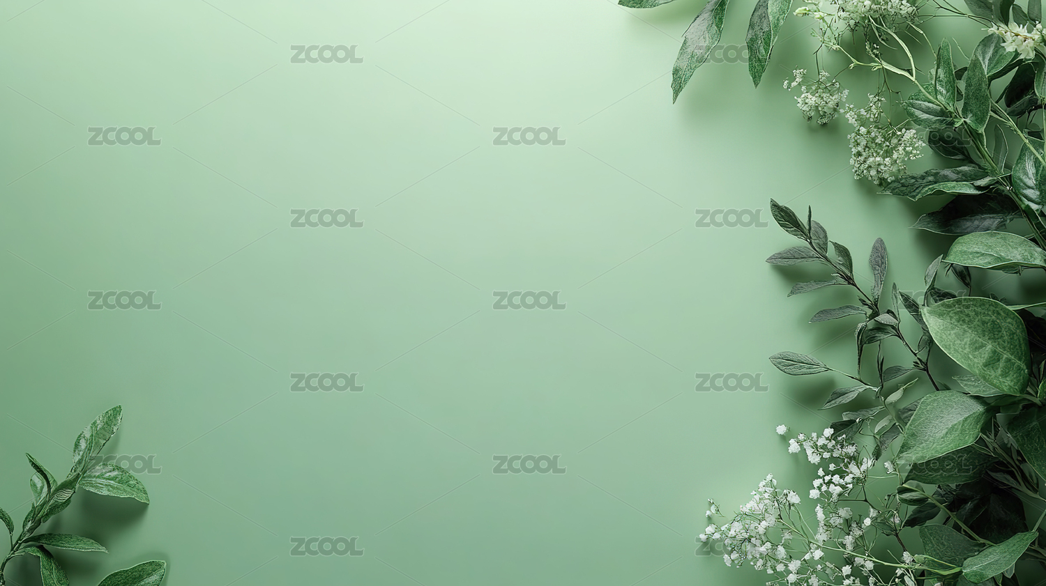 浅绿色背景的四周平铺着鲜花和叶子平面布局