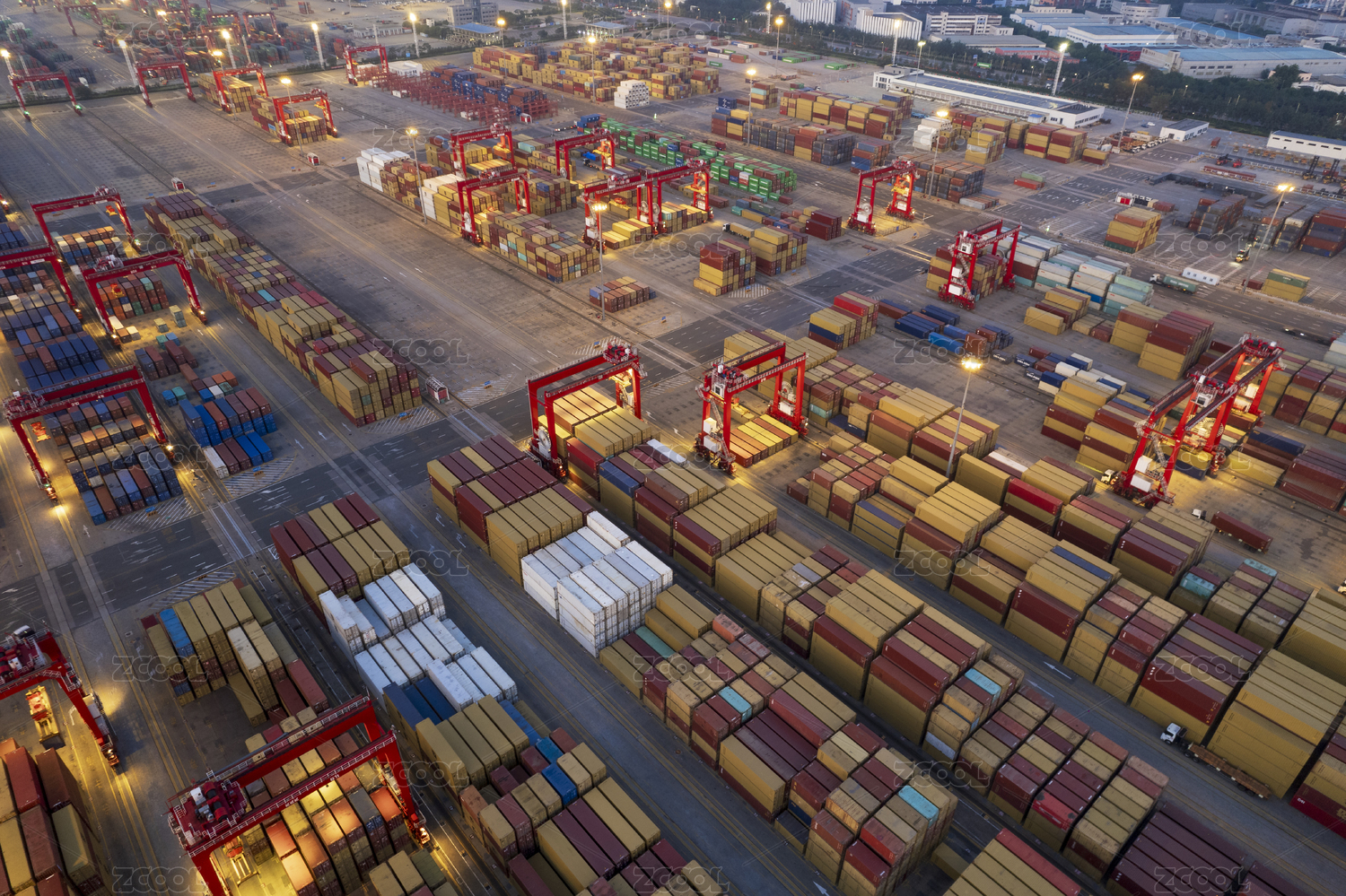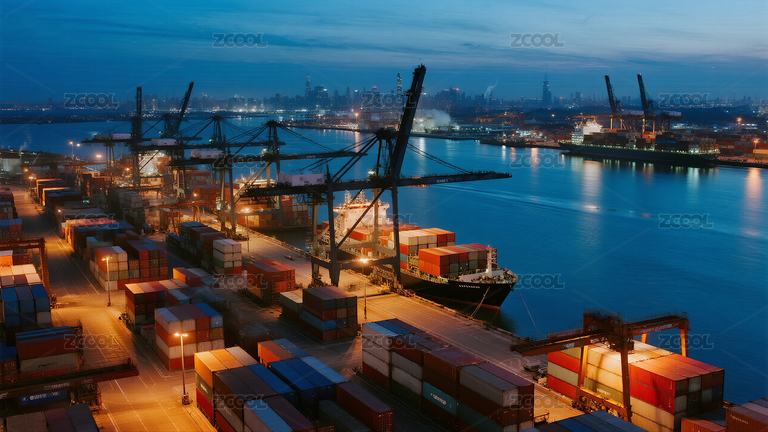深圳盐田港繁忙港口货物集装箱夜景蓝调航拍