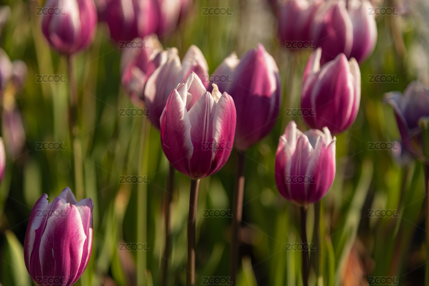 美丽的郁金香花盛开领域的特写镜头,从上面查看。