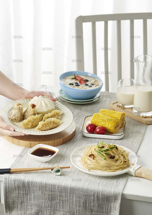 餐桌上丰盛的早餐 燕麦包子面条烧卖