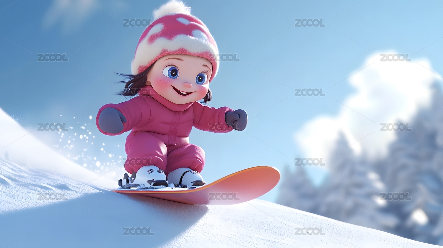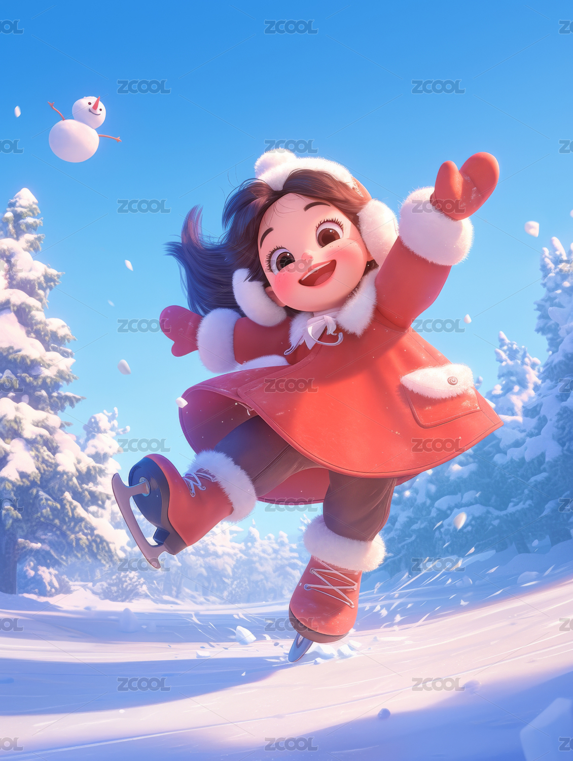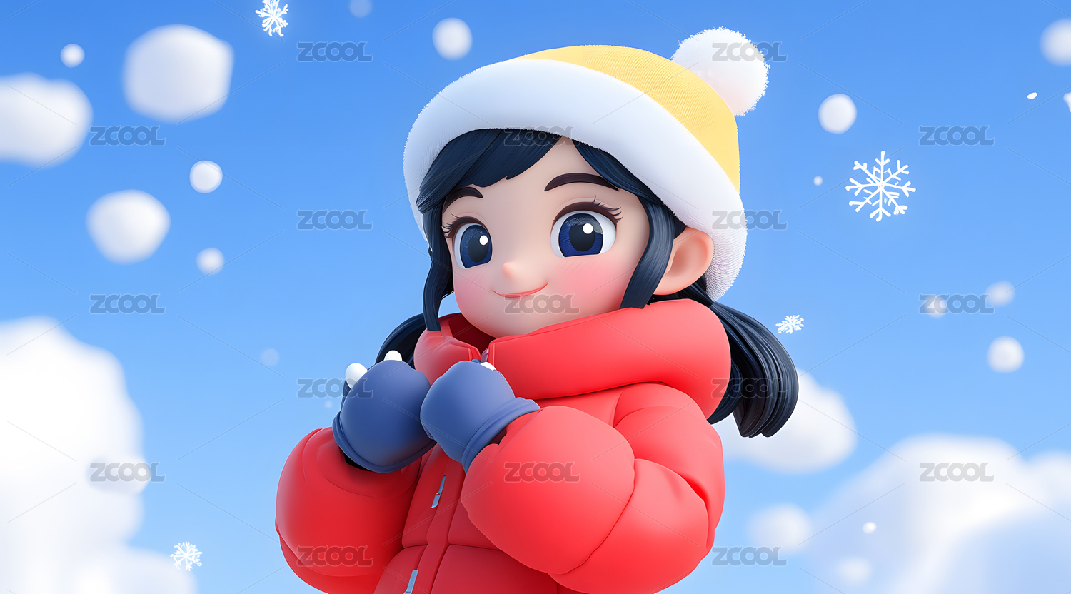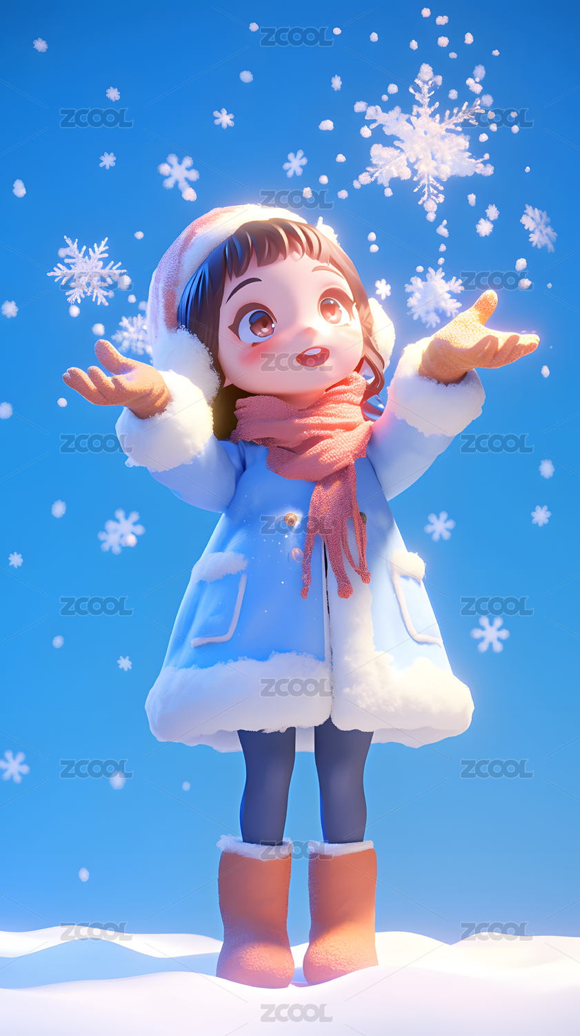 3D卡通冬天雪花中的女生
