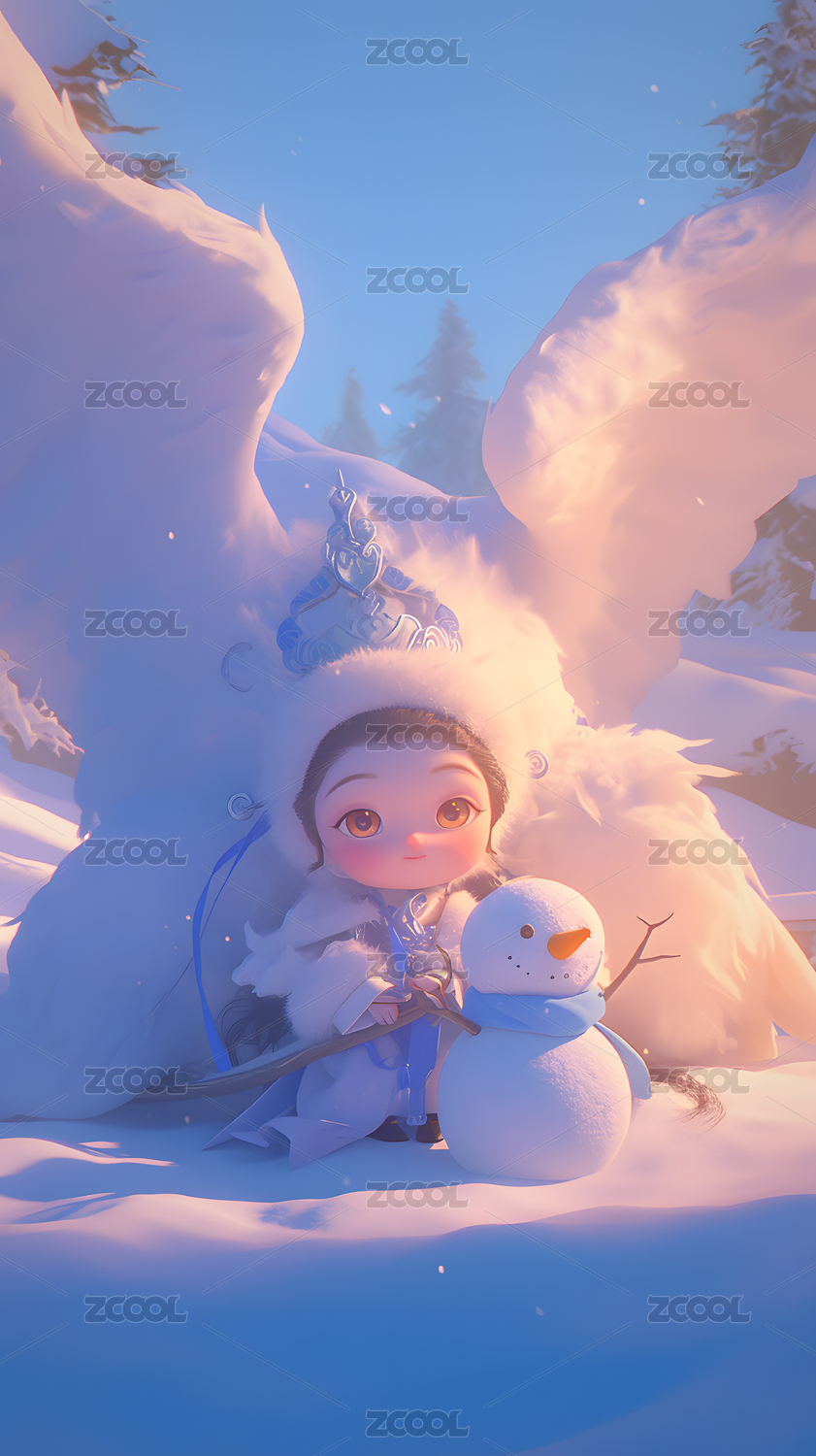 雪地女孩与雪人冬日温馨场景