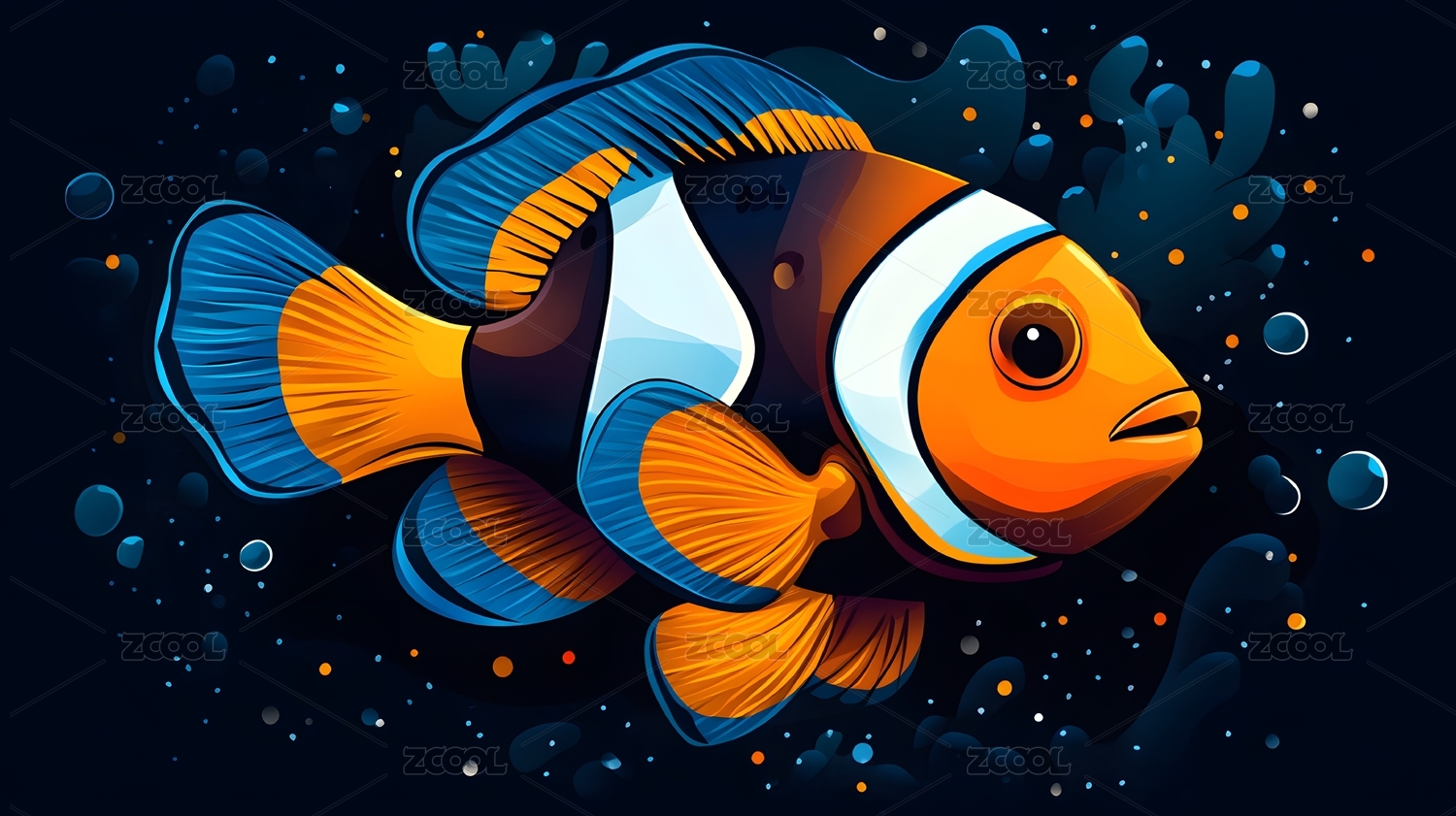 夜幕下珊瑚丛中可爱的卡通小丑鱼
