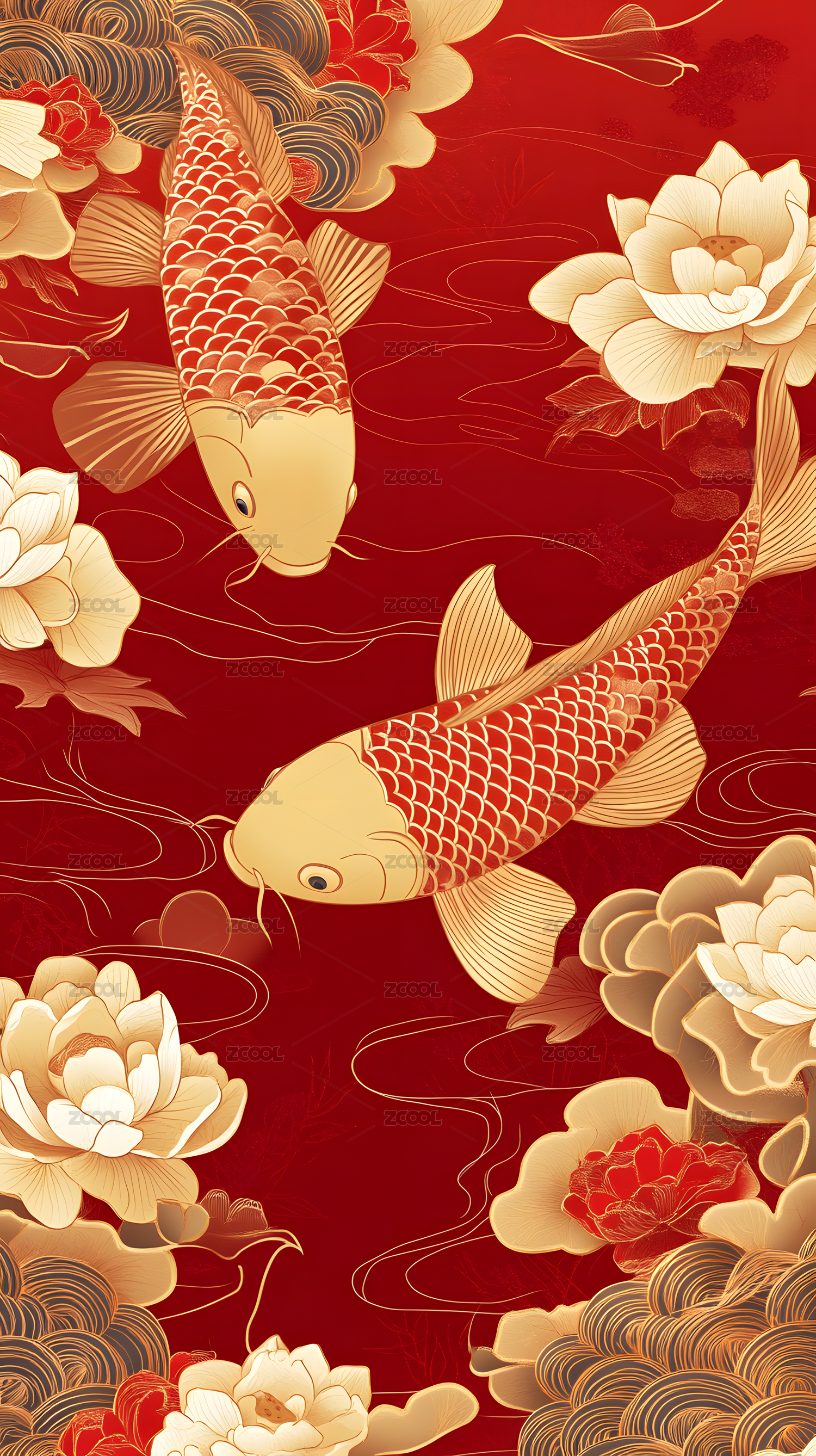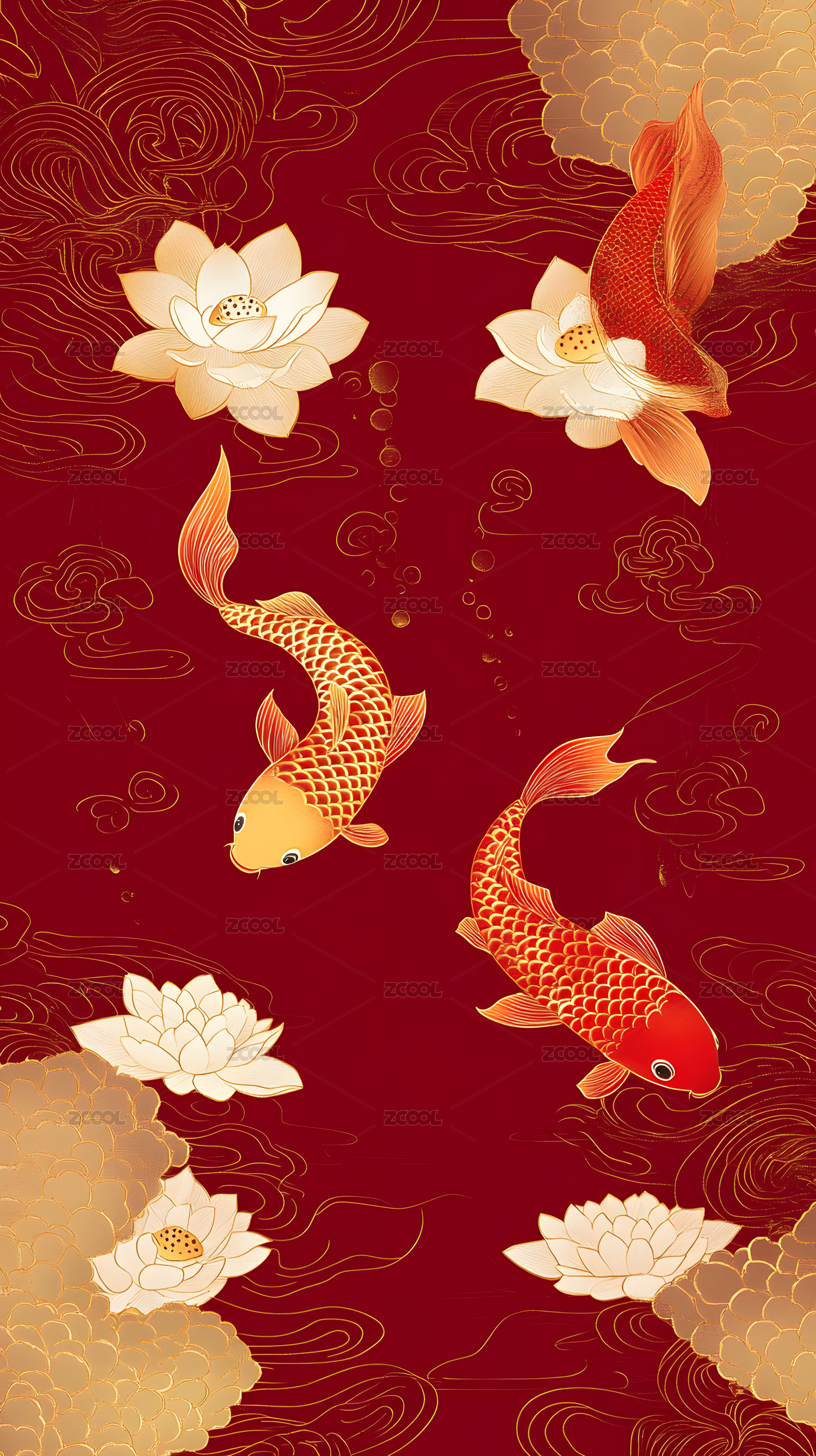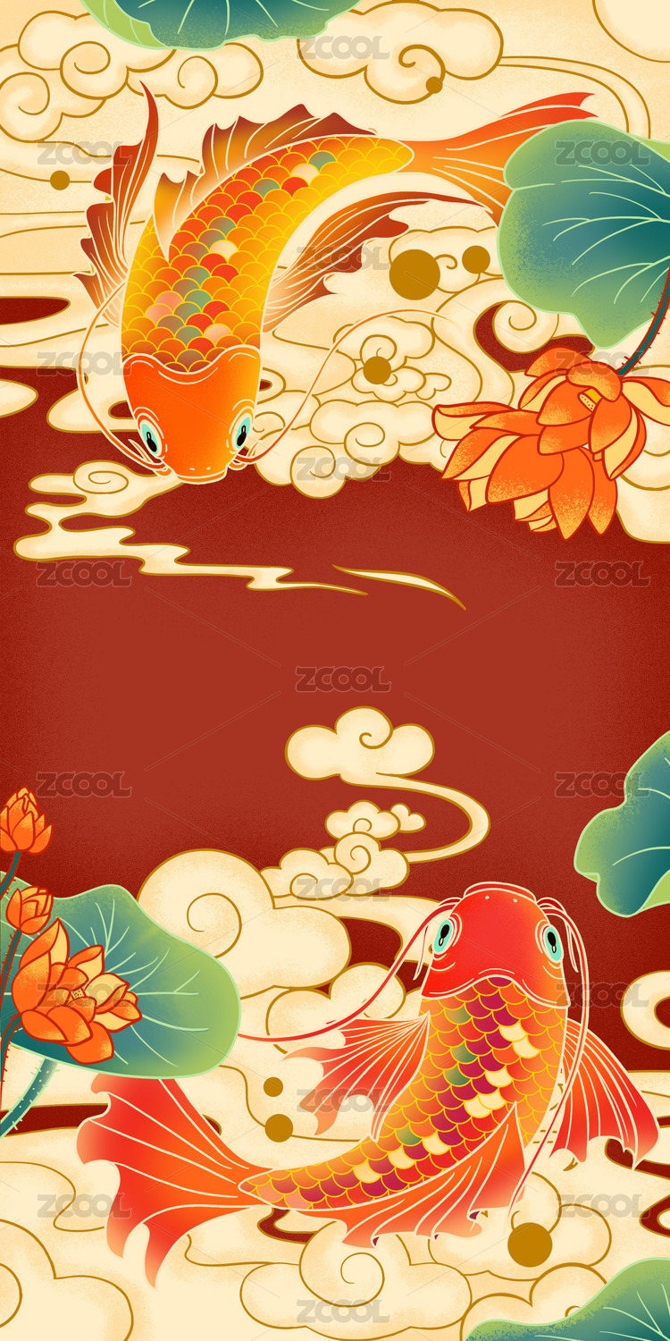 红色背景鲤鱼莲花祥云中国风