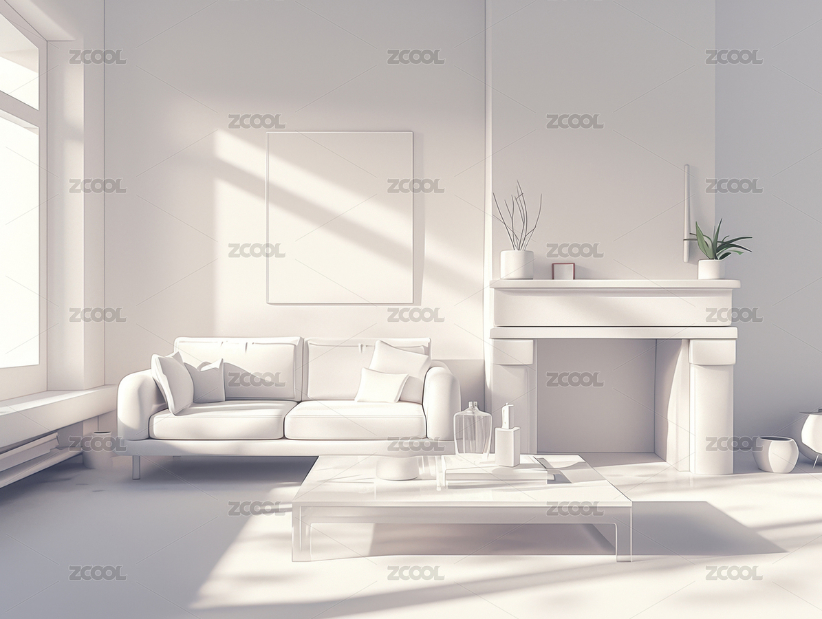 客厅,现代,简约,沙发,茶几,壁炉,植物,白色,阳光