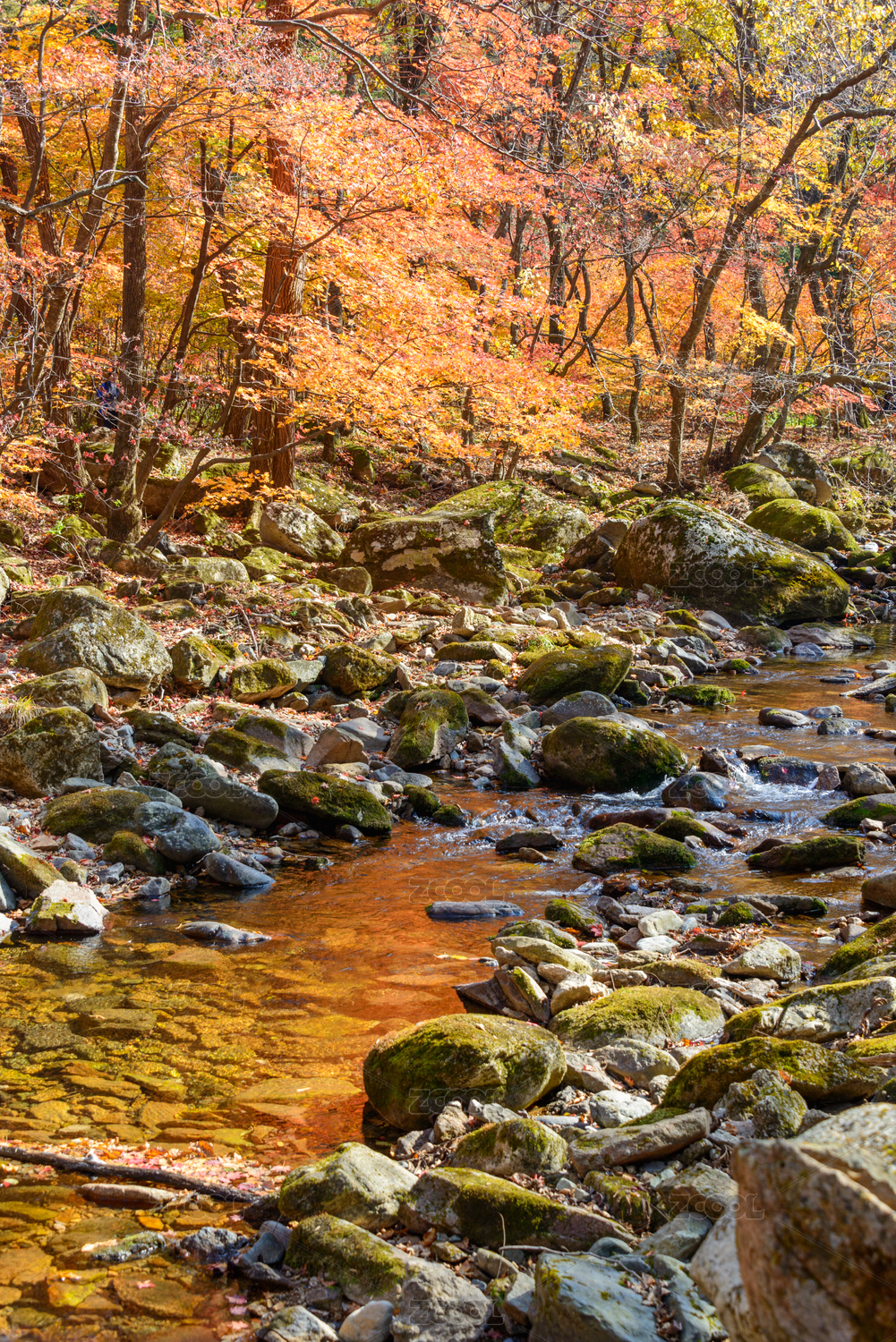 沈阳本溪老边沟,秋日山林红叶苔藓巨石景观